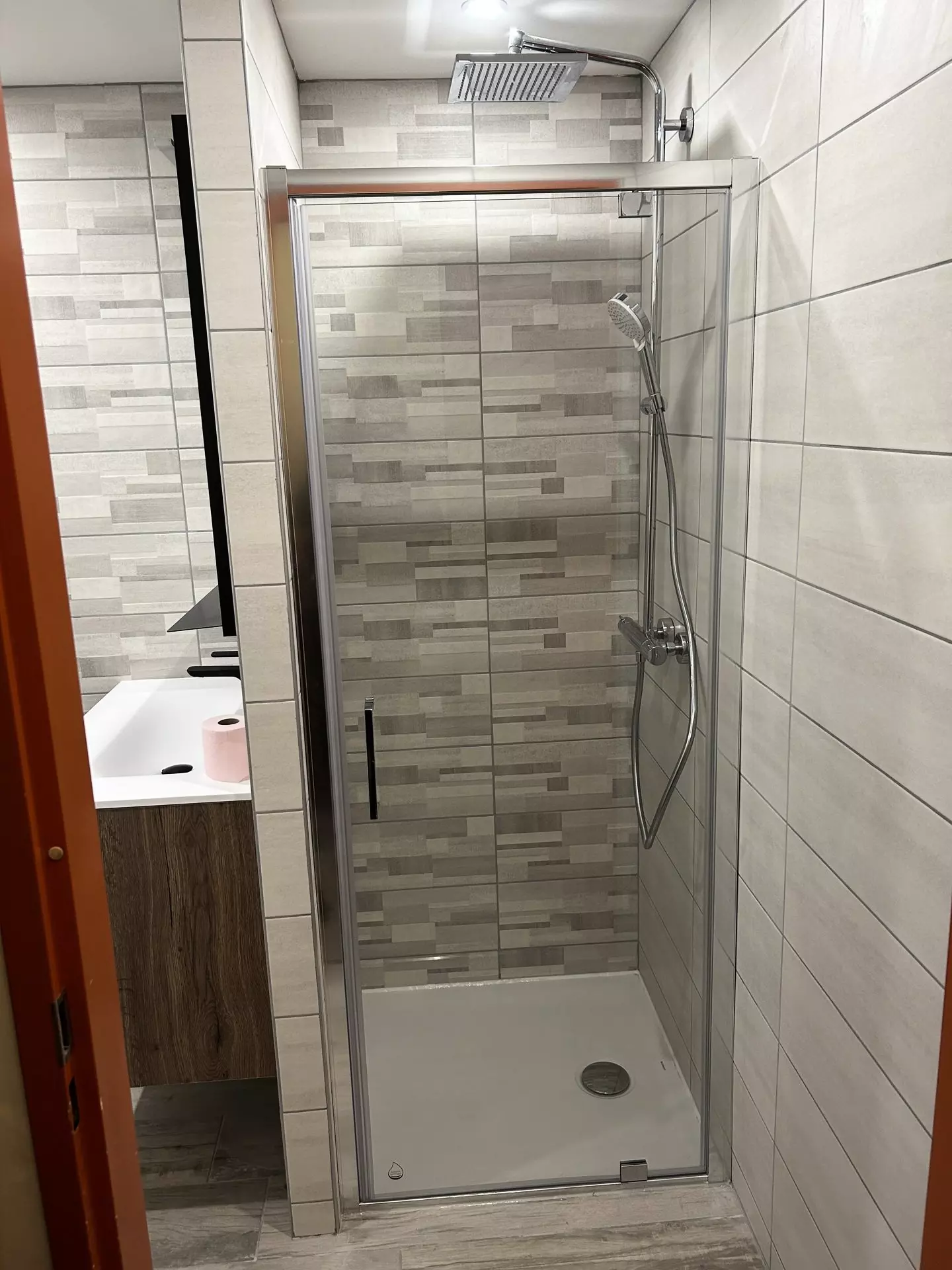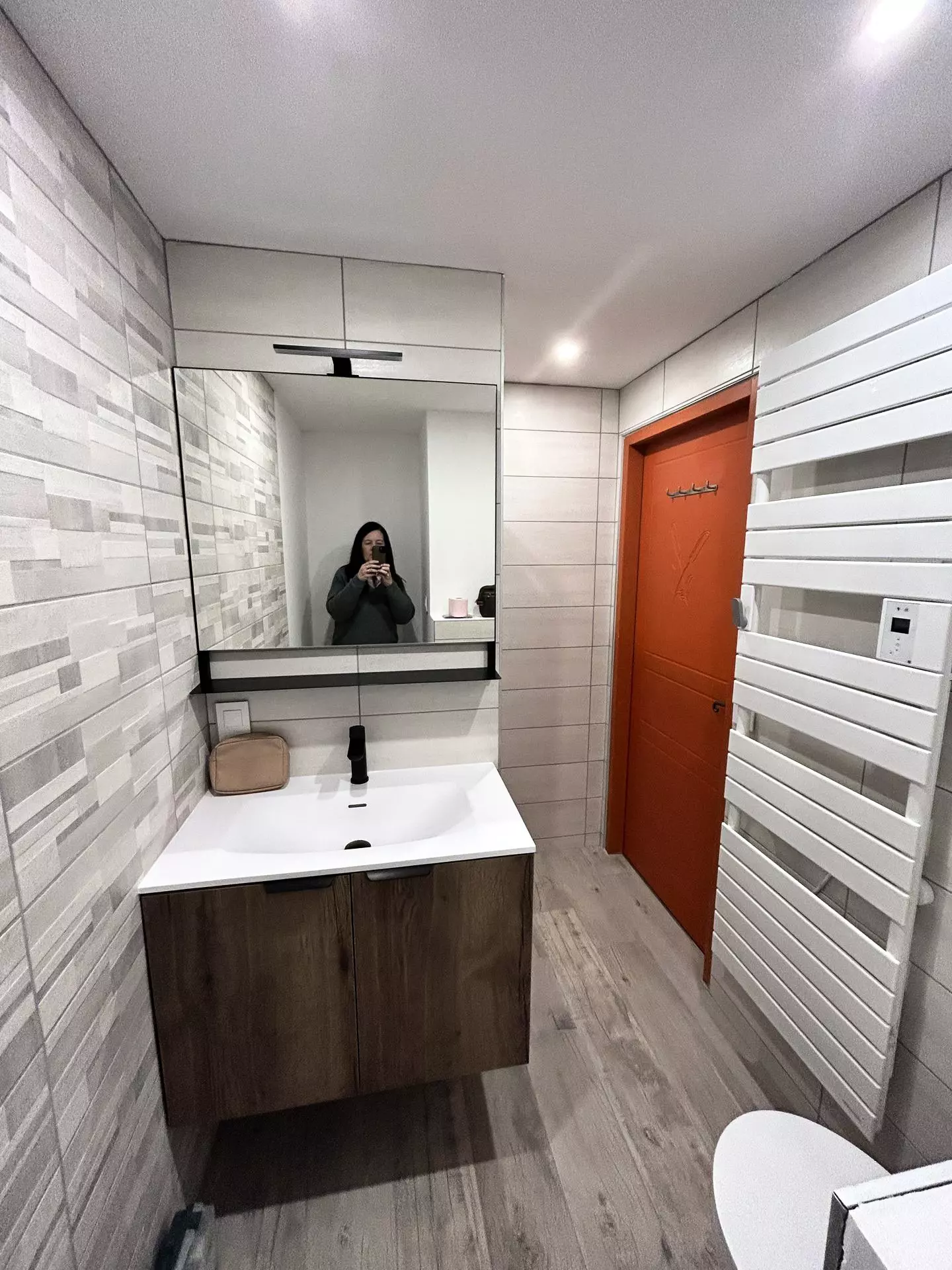 Le chalet est composé d'un sas d'entrée pour déposer vos affaires, puis directement à droite une salle de douche avec WC.