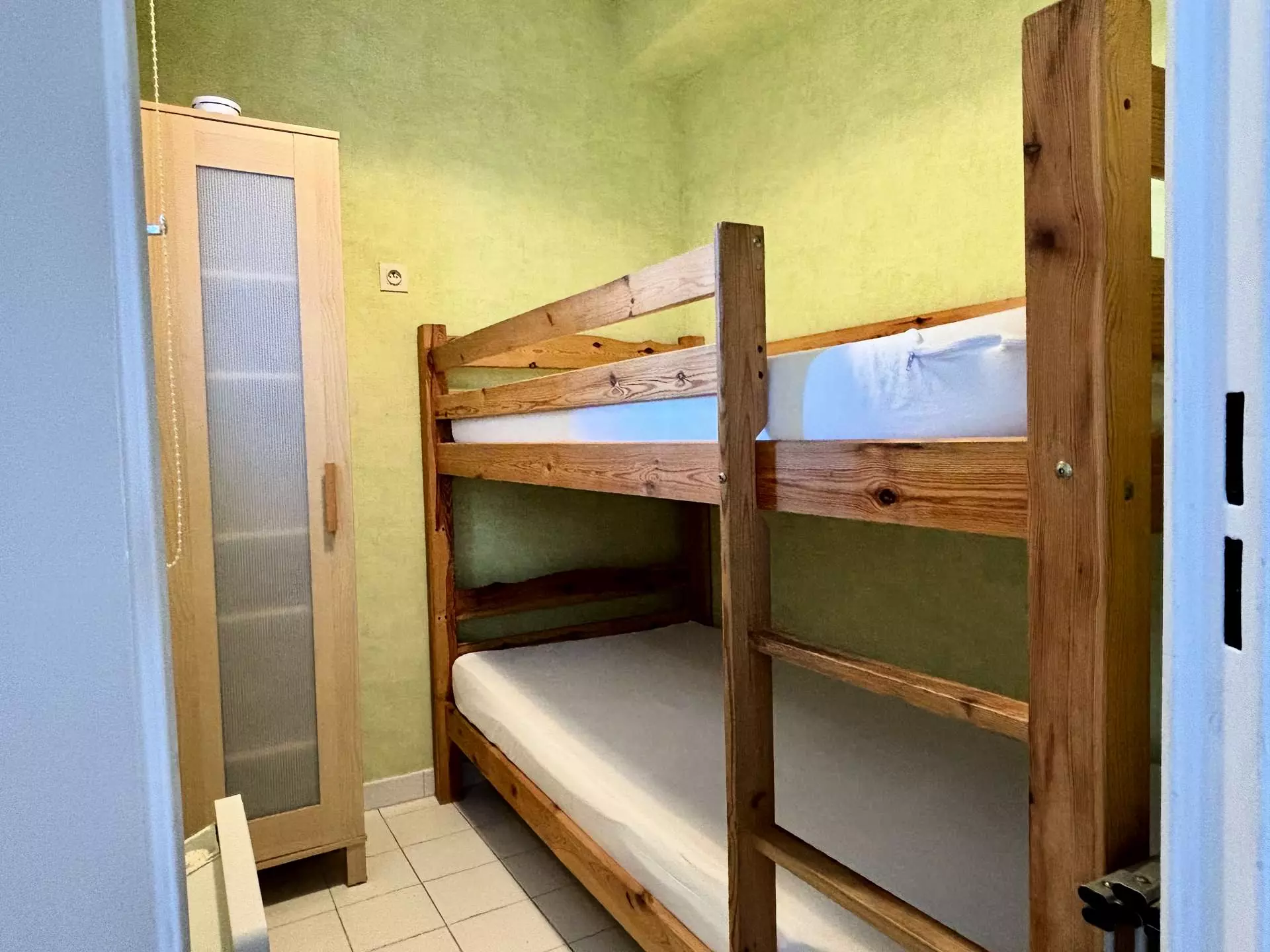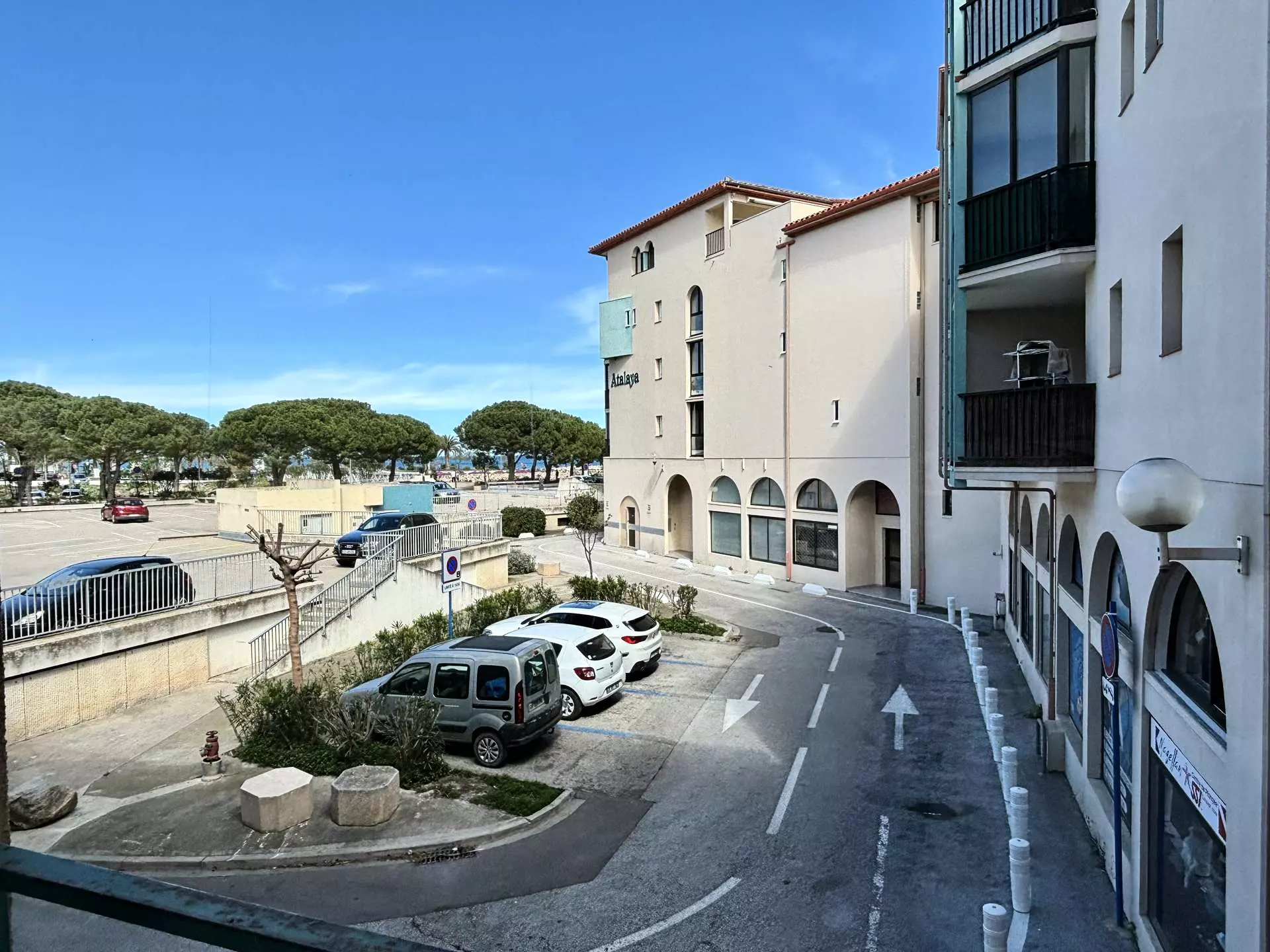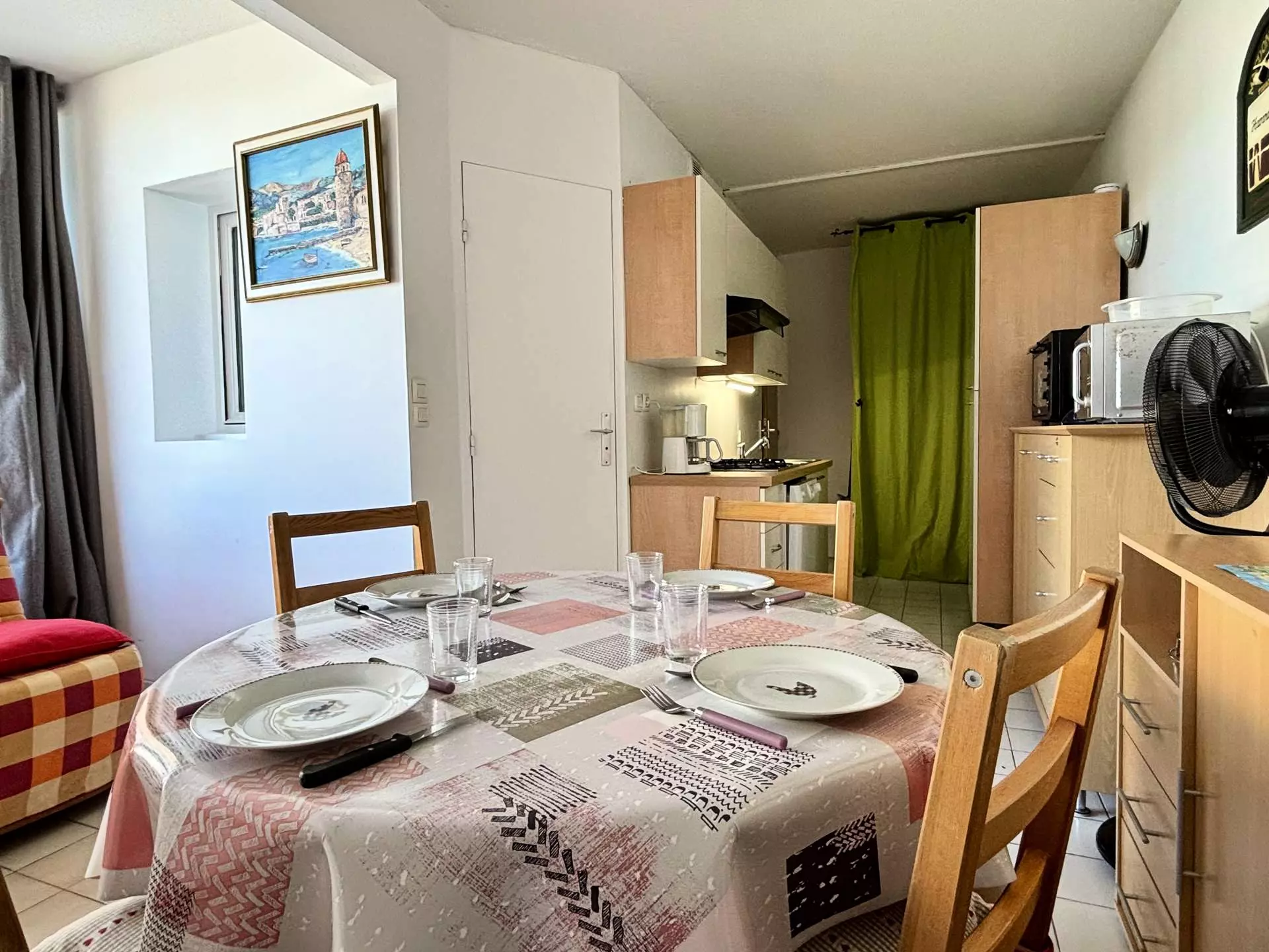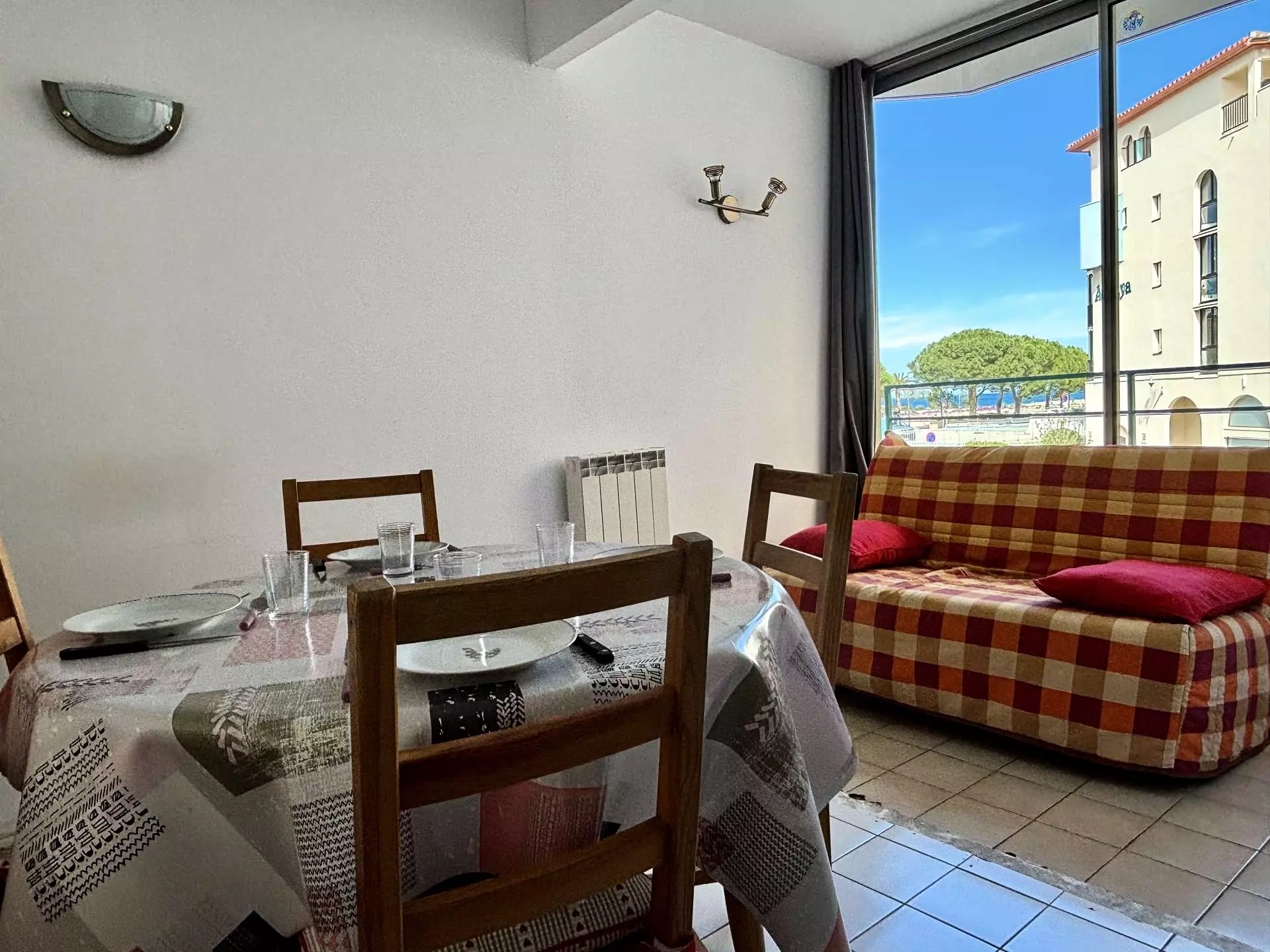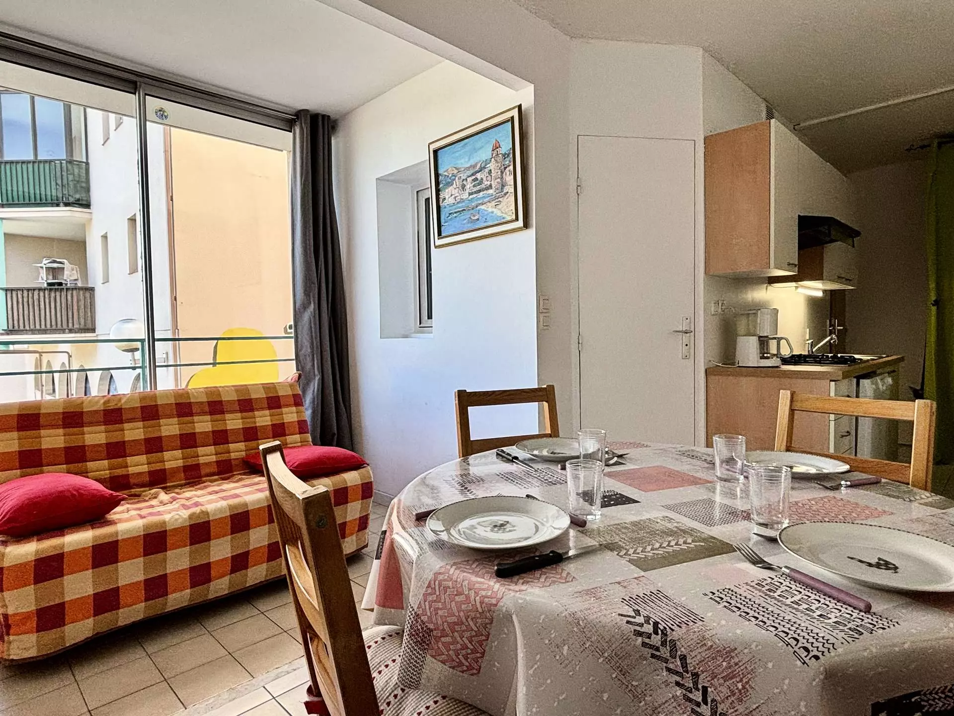 A 150m de la mer, sur le port de plaisance d'Argeles sur mer, cet appartement de vacances au 1er étage, se compose d'un séjour avec kitchenette équipée, un coin nuit avec un lit en 140 deux places, un coin cabine avec deux lits superposés 1 place et une salle d'eau avec WC.