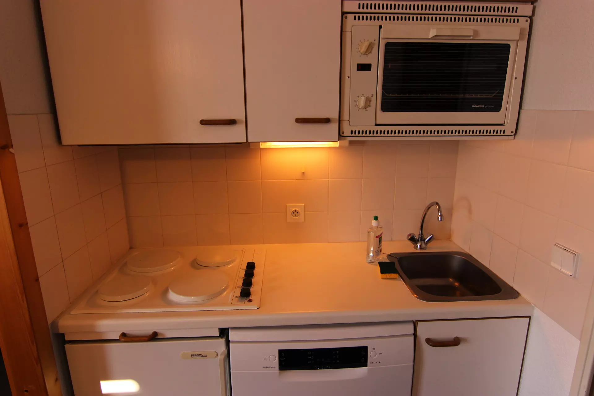 Coin cuisine: micro-ondes, plaques électriques, réfrigérateur, lave-vaisselle et hotte.