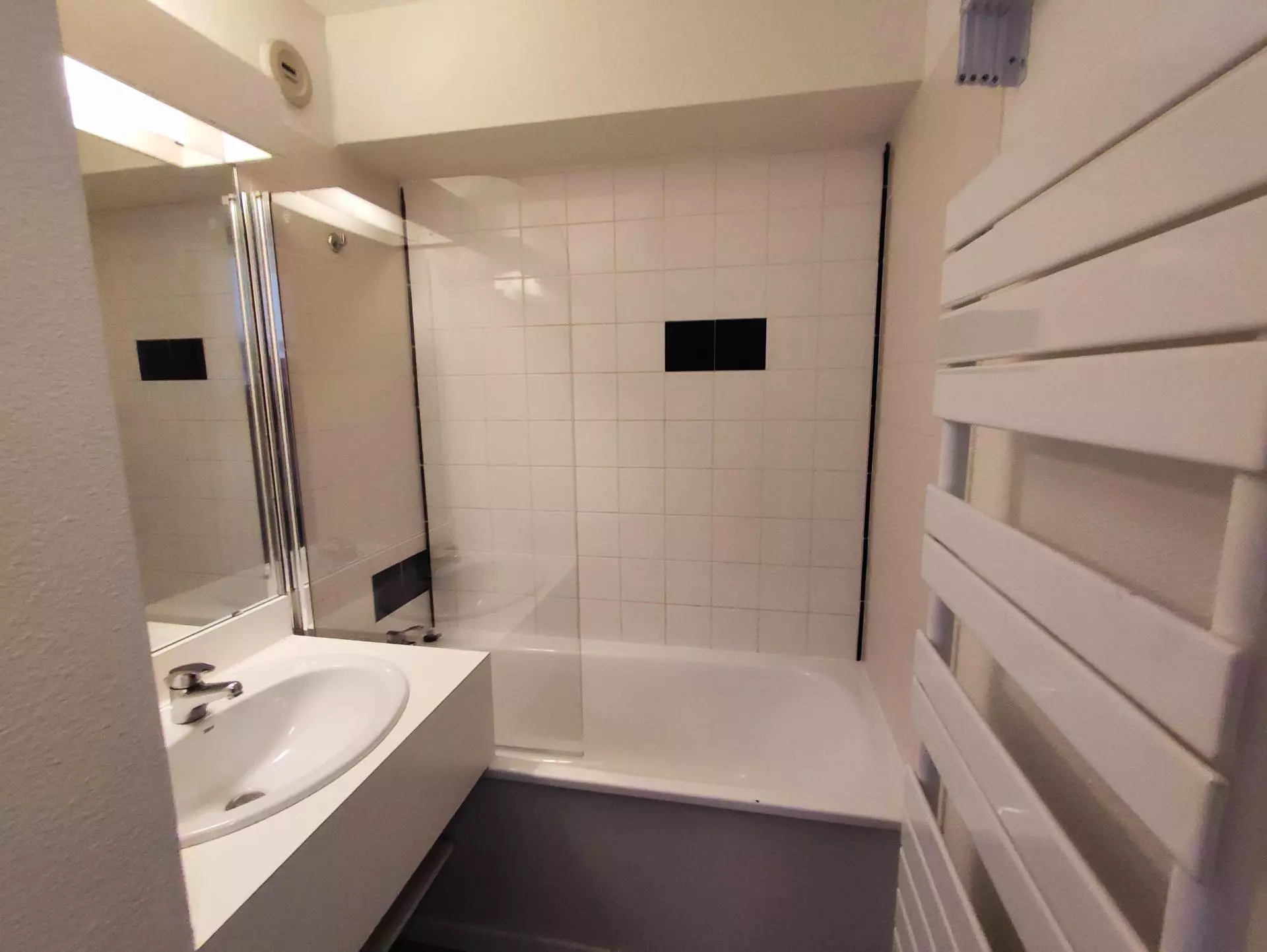 Salle de bain : baignoire, lavabo, sèche serviettes.