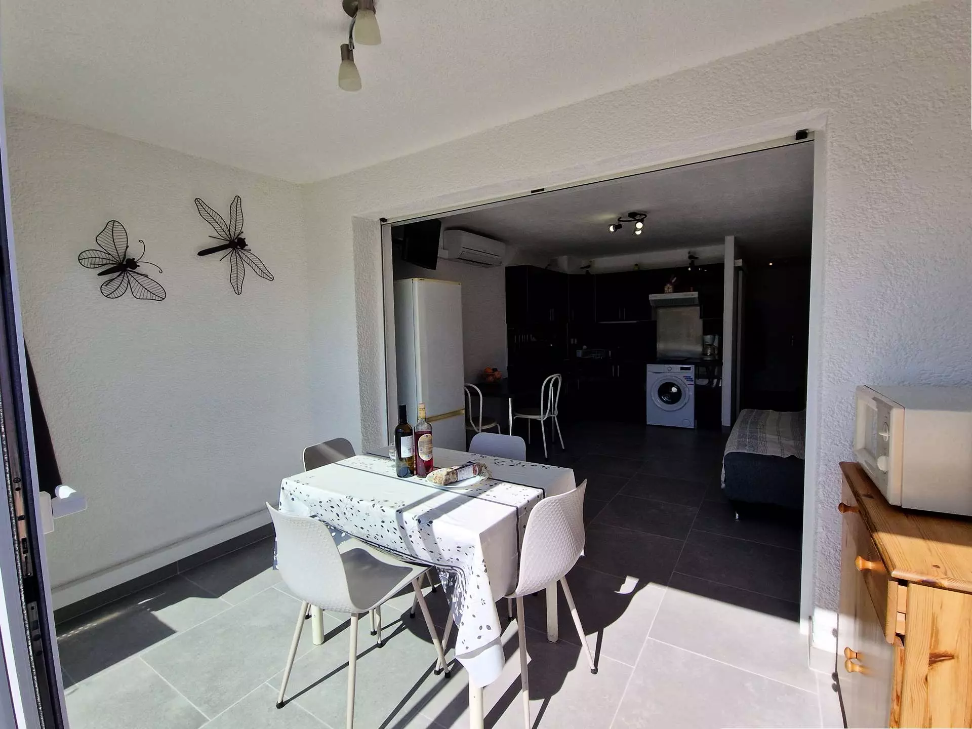 L'appartement se compose d'un séjour avec table et chaises, d'un coin cuisine entièrement équipé (réfrigérateur/congélateur, plaques électriques, micro-ondes, cafetière électrique), ainsi que d'un salon confortable avec canapé convertible et TV, parfait pour vos moments de détente.