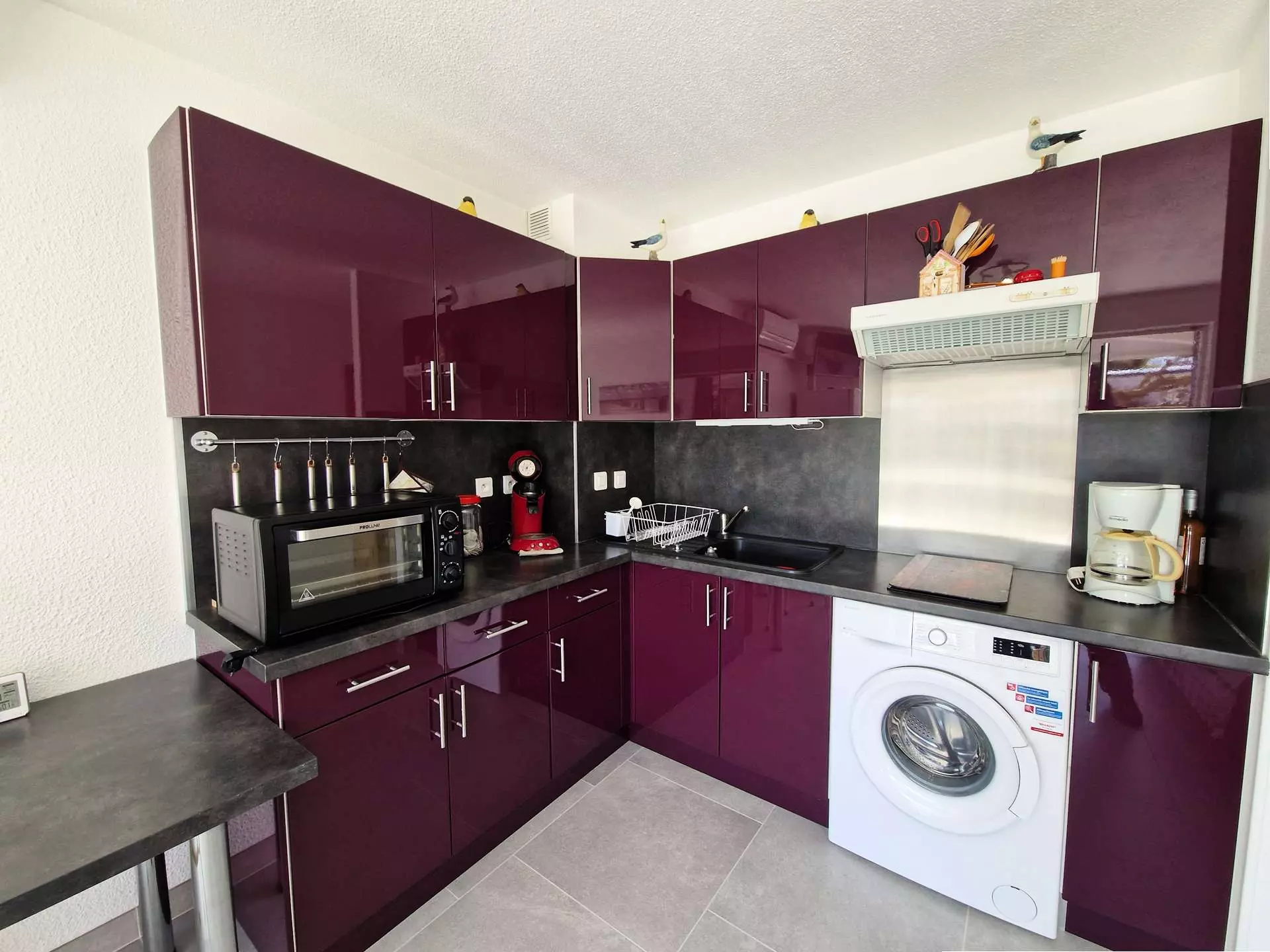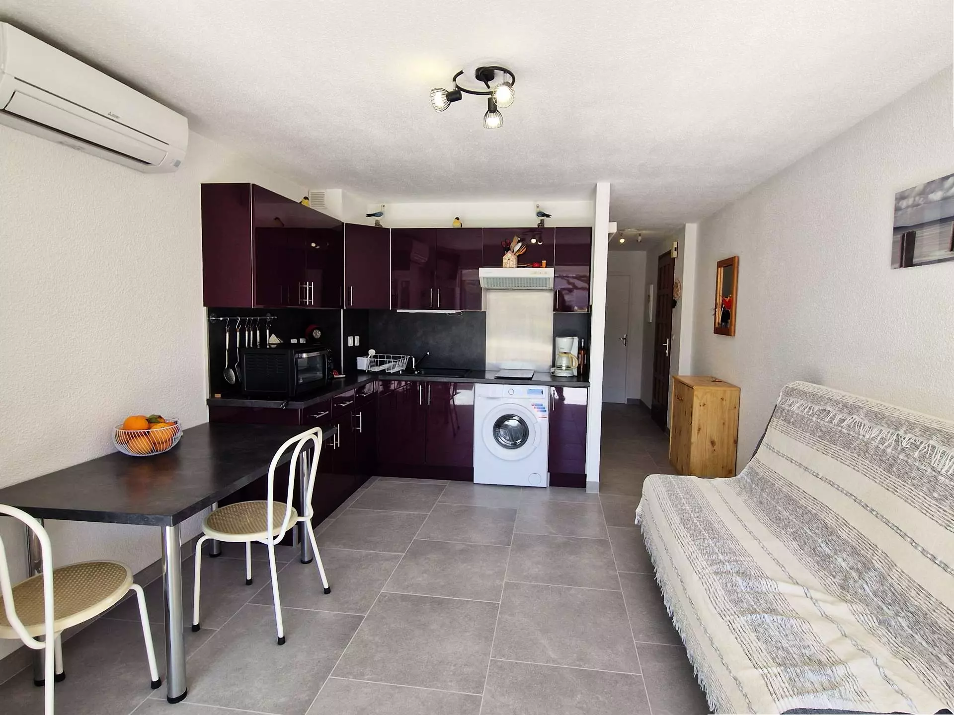 - Cuisine moderne et entièrement équipée : Réfrigérateur/congélateur, plaque vitrocéramique, micro-ondes, mini-four, cafetière, lave-linge... tout le nécessaire pour cuisiner facilement.