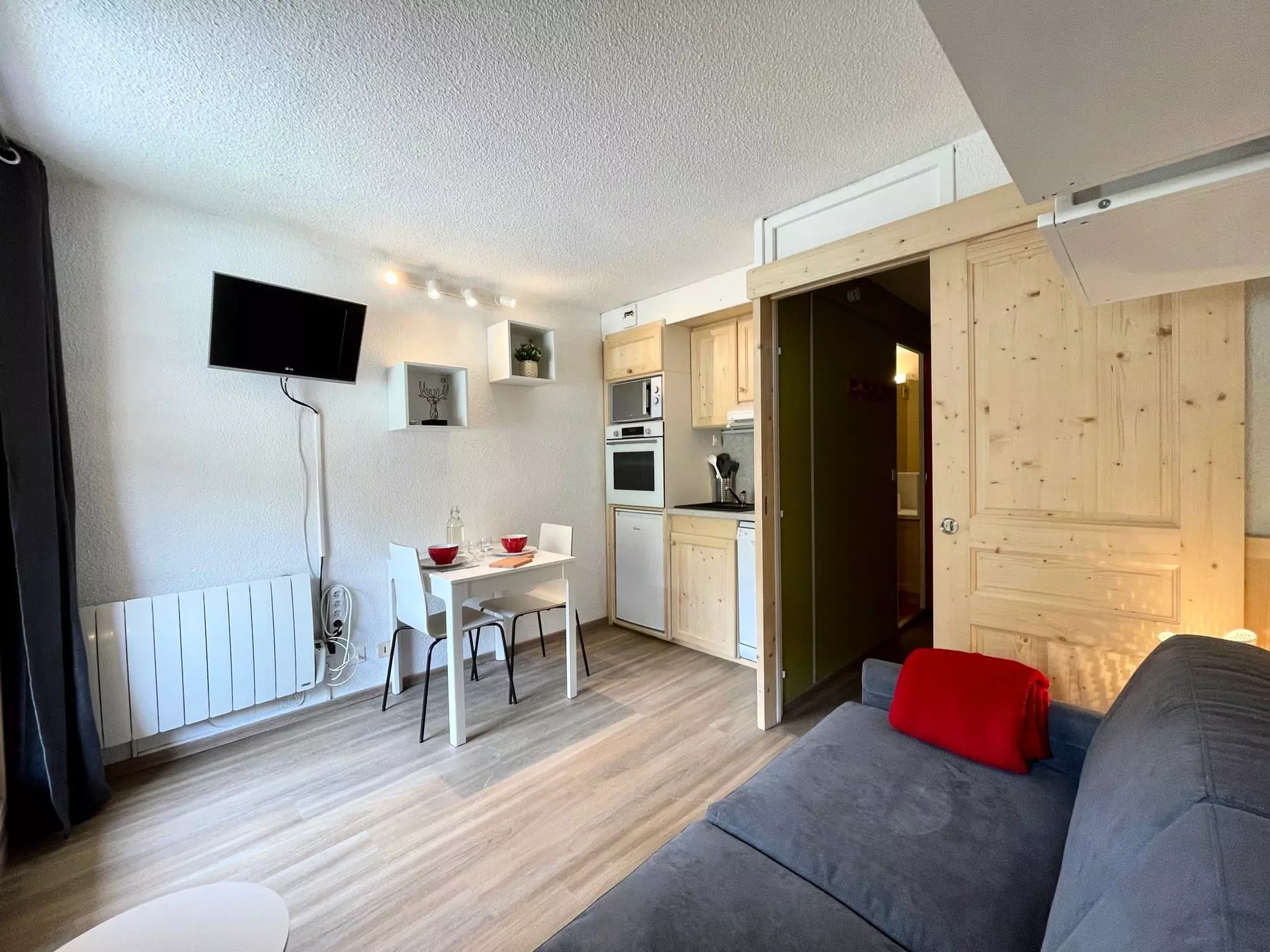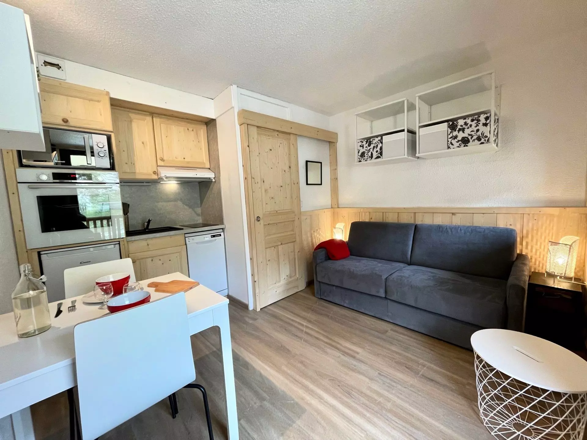 Il dispose de lits superposés rabattables dans l'entrée et d'un canapé lit (matelas double) dans la pièce principale.