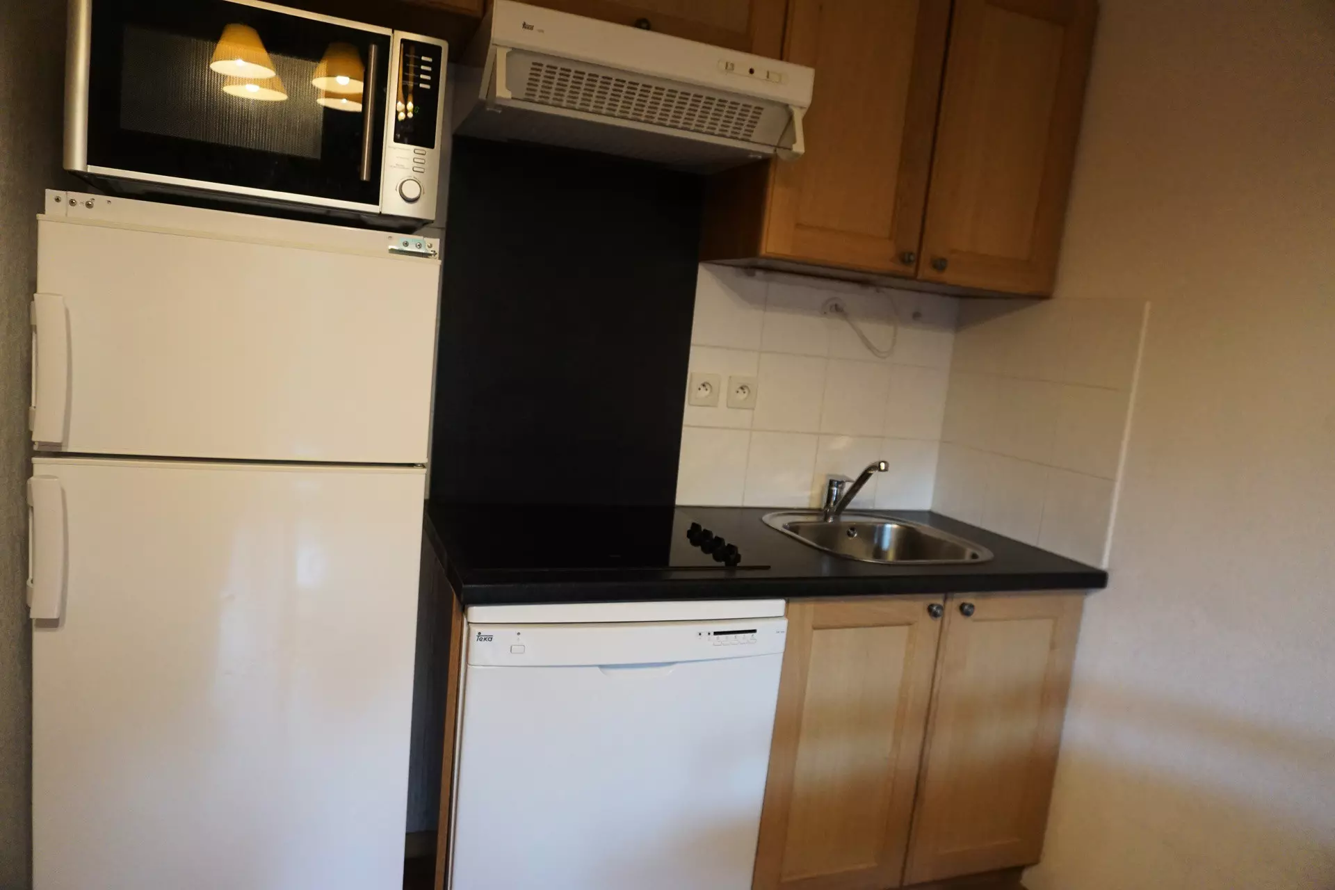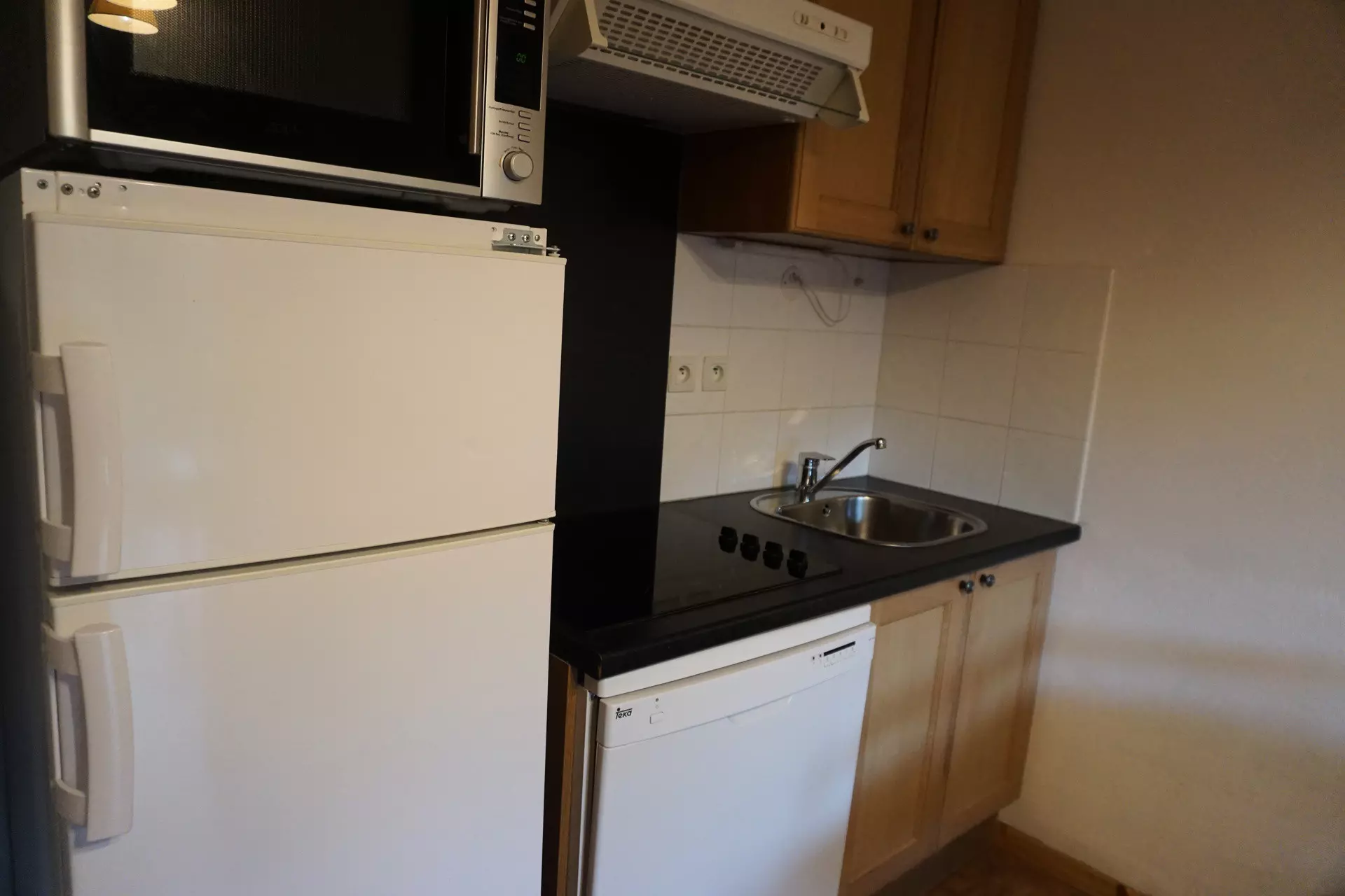 Coin cuisine : 4 plaques vitrocéramiques, frigo/congélateur, micro-ondes, lave-vaisselle.