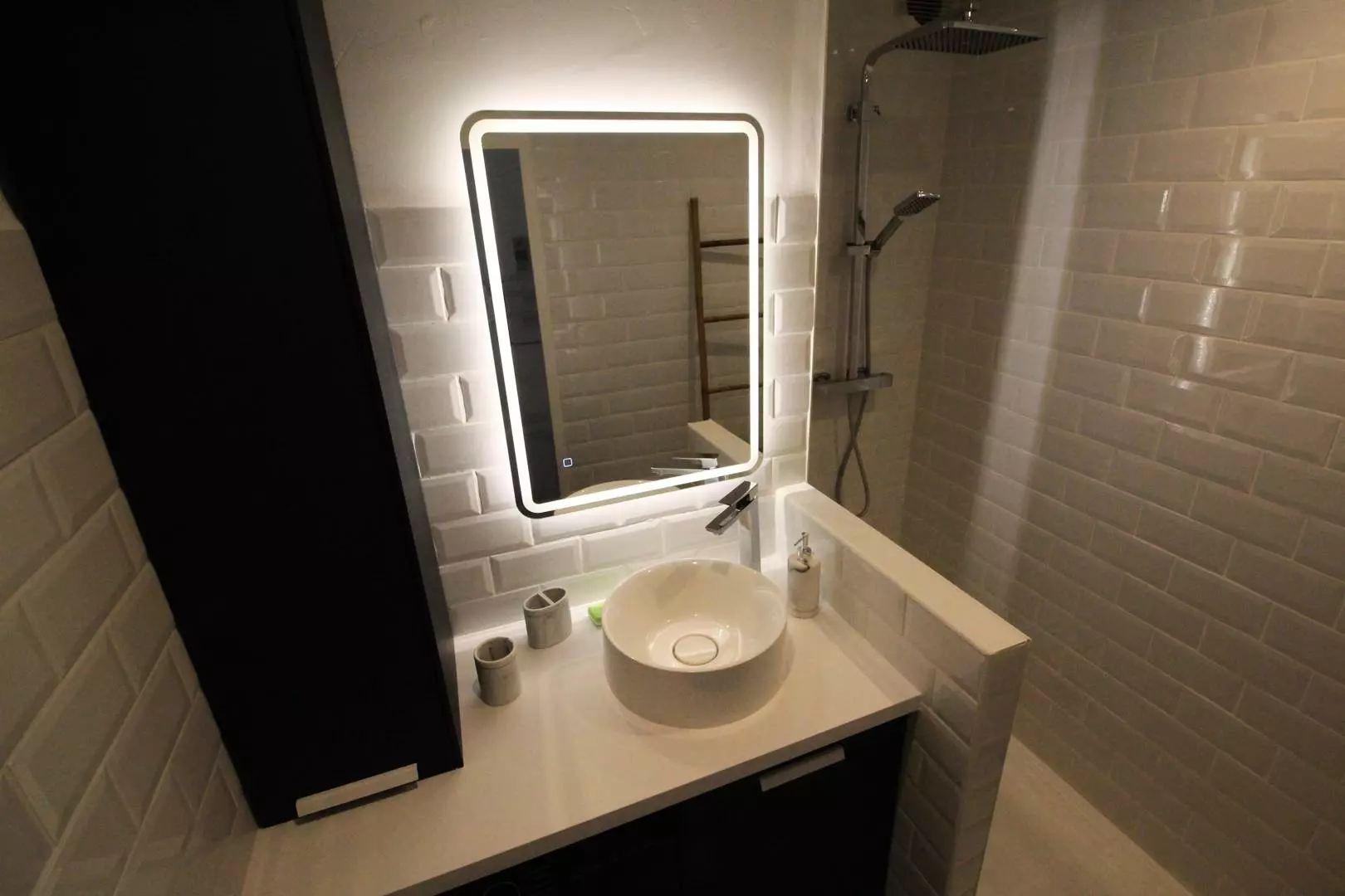 Entrée, salle d'eau avec douche, wc séparé. une kitchenette séparée équipée (d'une plaque vitrocéramique, lave-vaisselle, lave-linge, four multifonction, grille-pain, cafetière électrique, bouilloire).