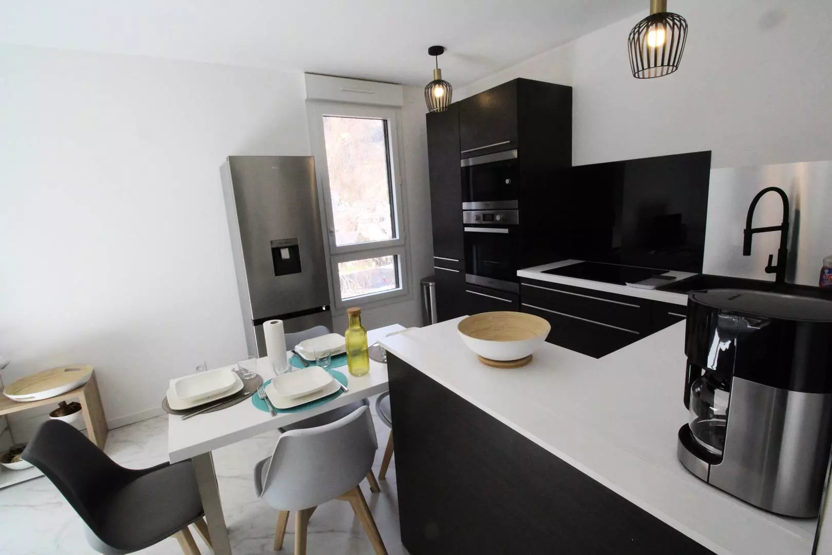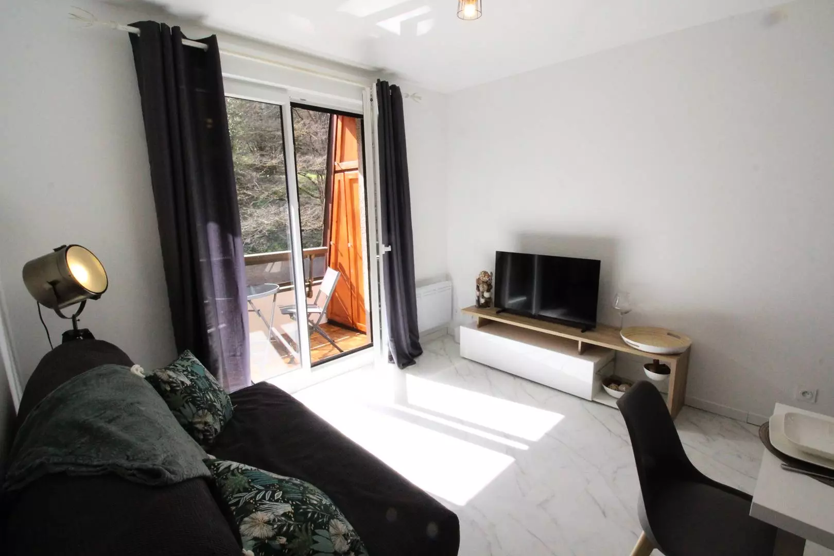 Une kitchenette équipée (d'une plaque vitrocéramique, lave-vaisselle, lave-linge, four multifonction, grille-pain, cafetière électrique, bouilloire, réfrigérateur congélateur) donnant sur un séjour avec bz 2 personnes, téléviseur. ce séjour donne sur une loggia exposée sud et ouest avec salon de jardin et belle vue.