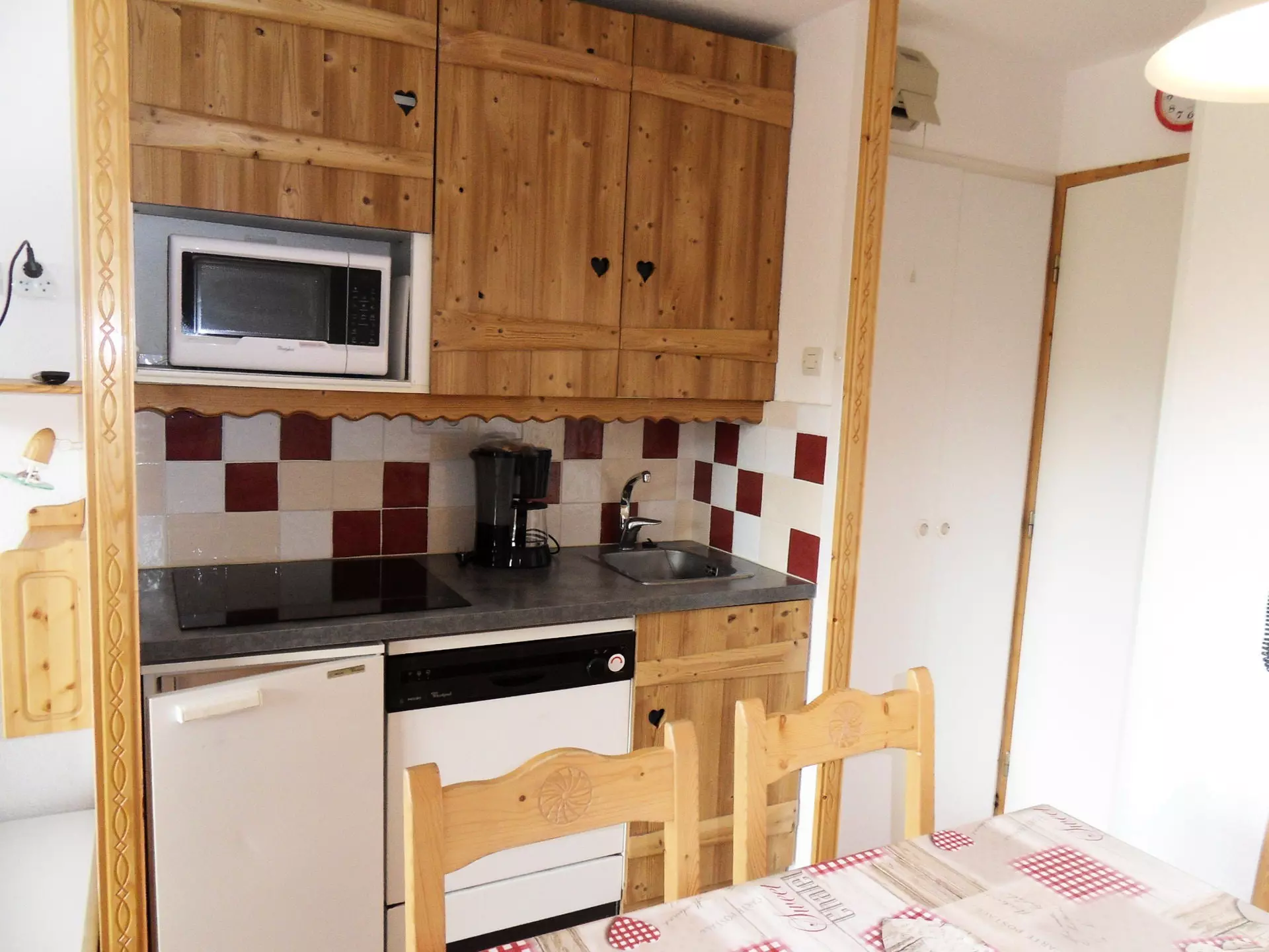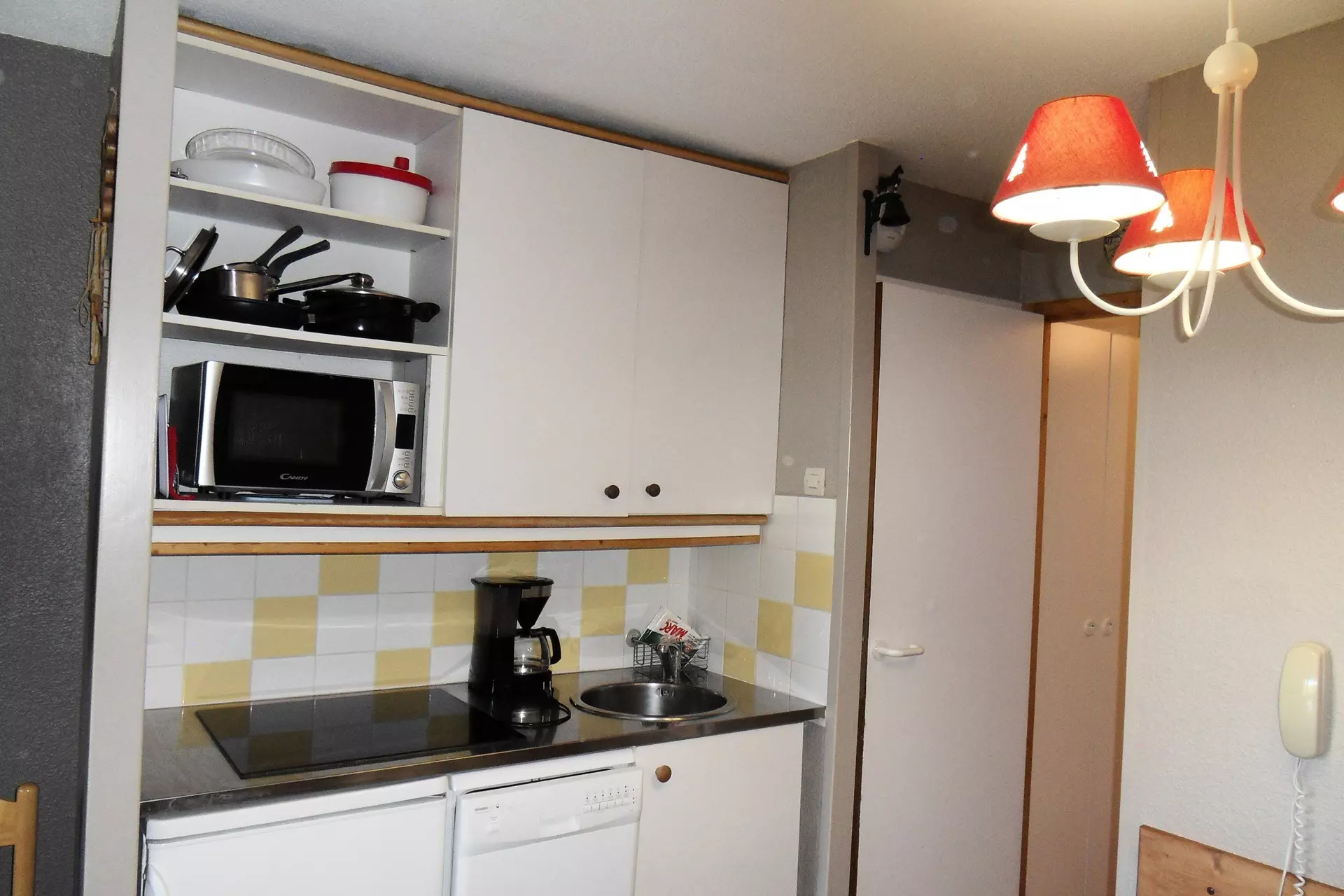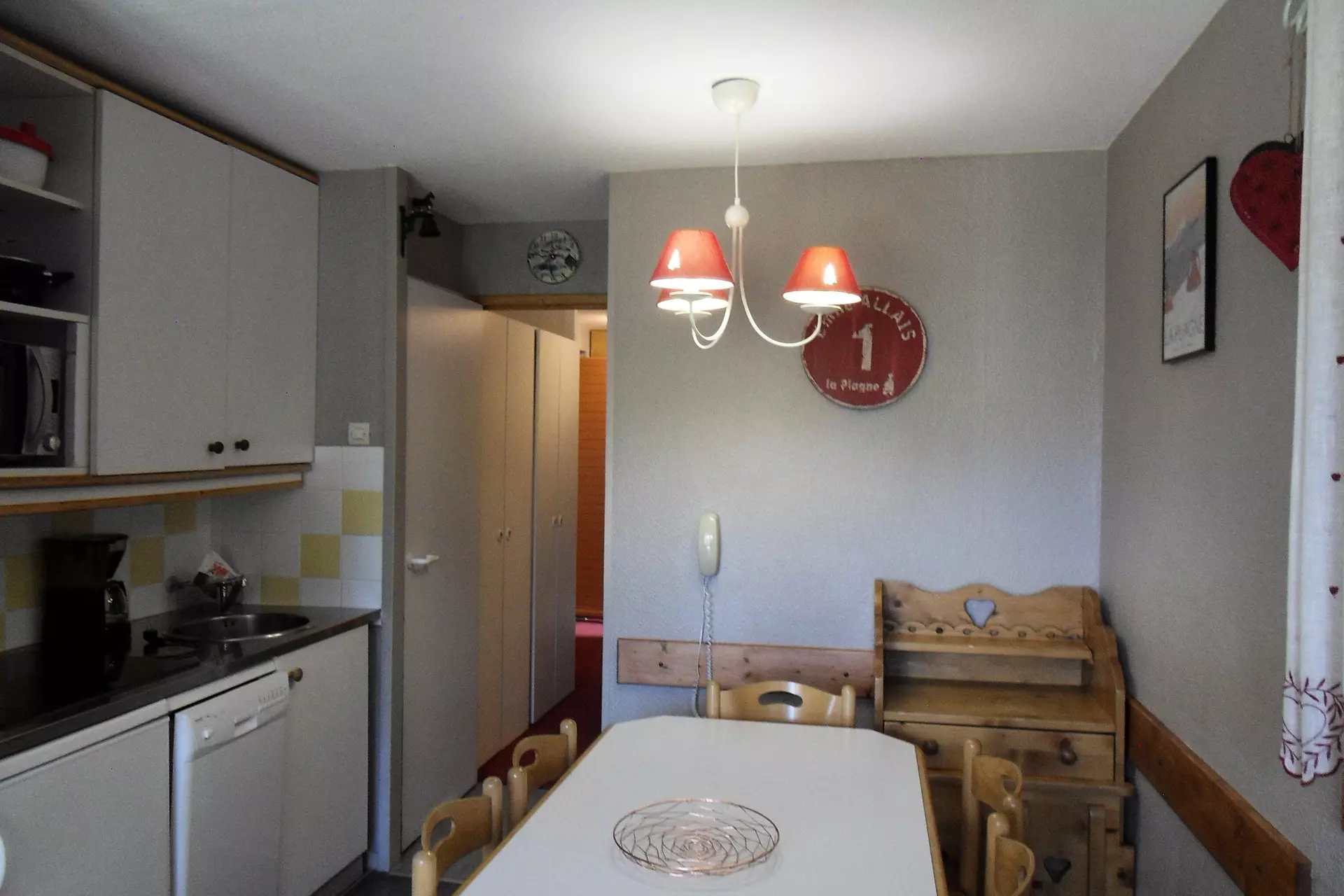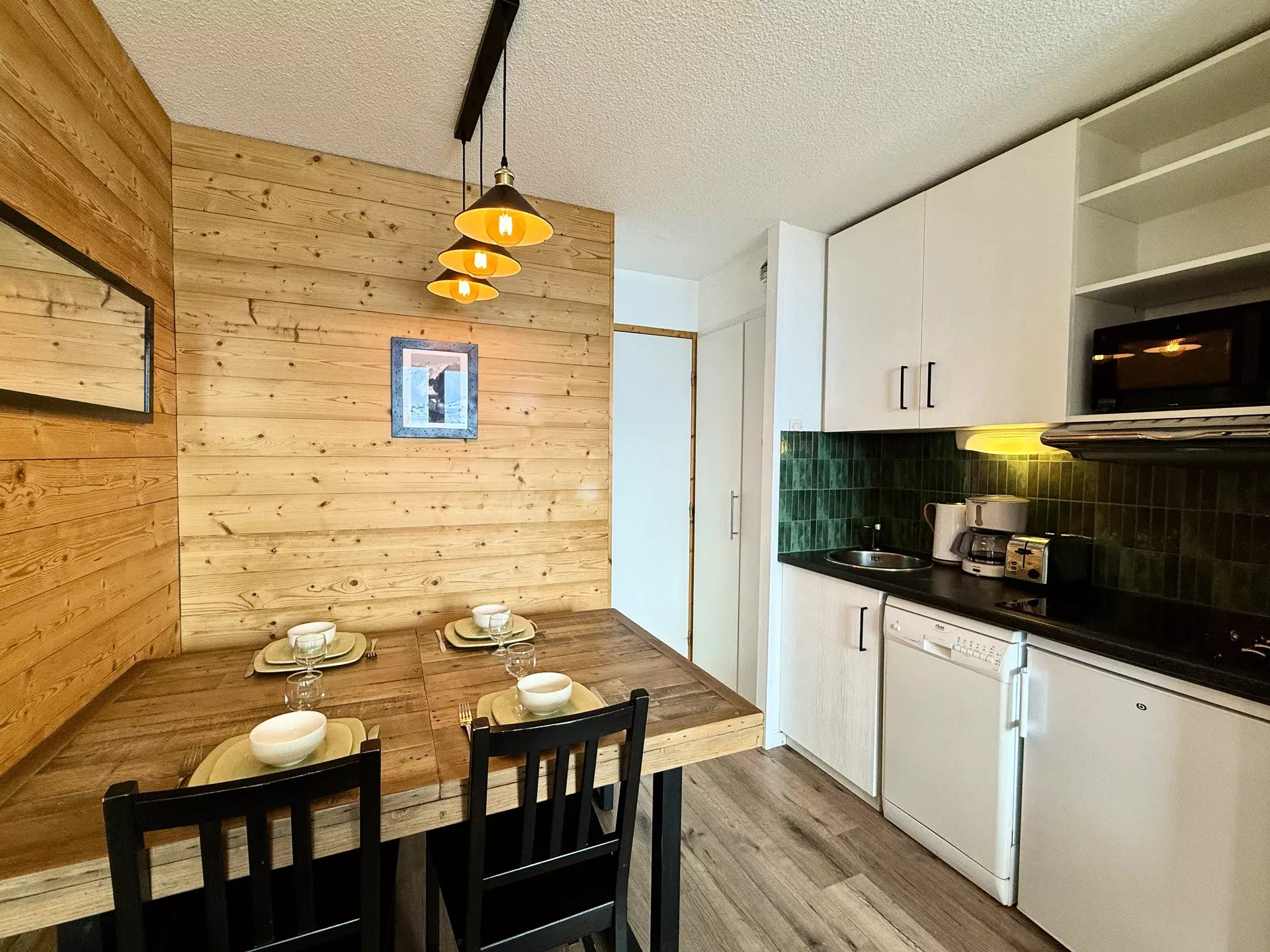Cuisine : ouverte avec 1 plaque vitrocéramique 4 feux, un micro-ondes grill, un lave vaisselle et un réfrigérateur
