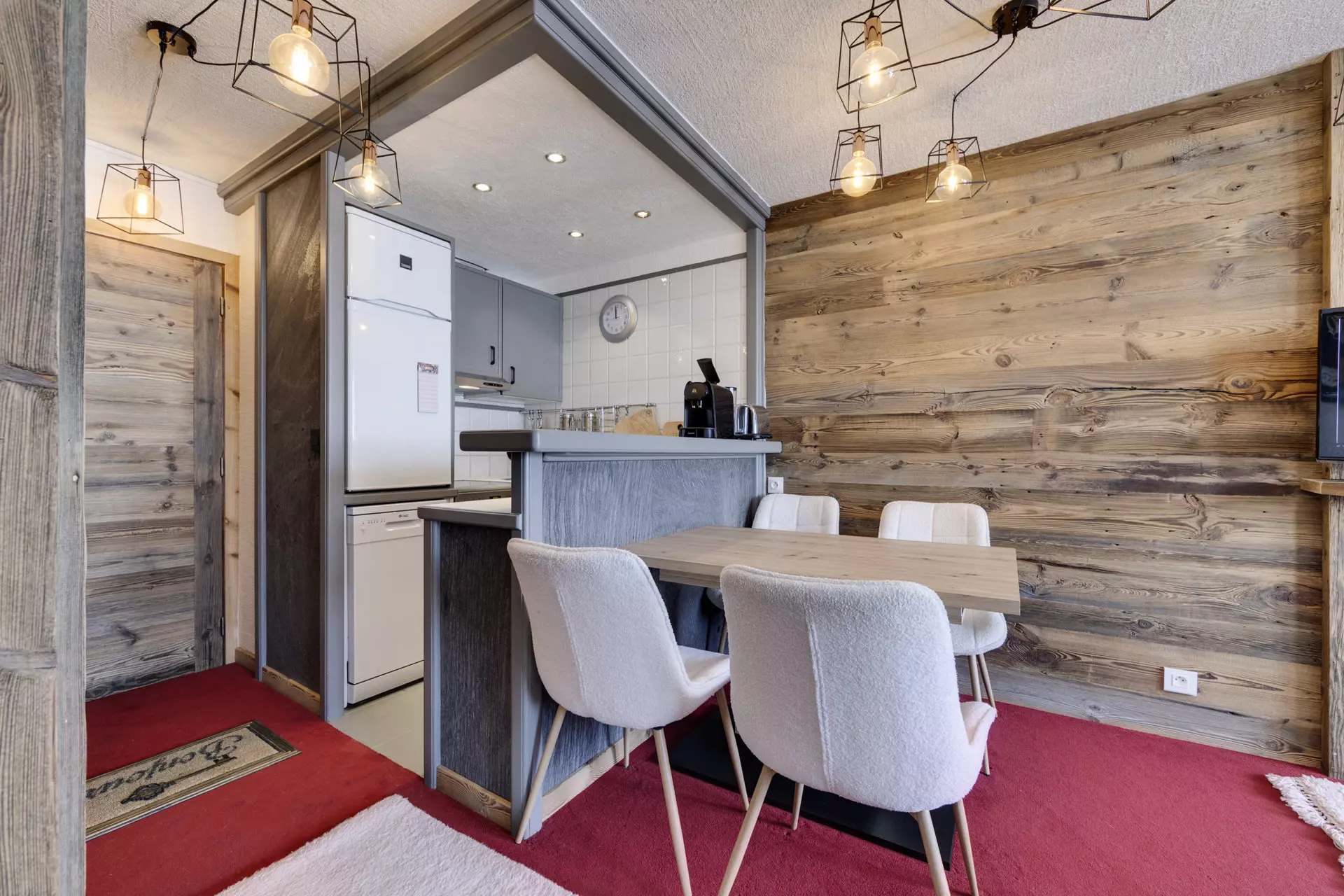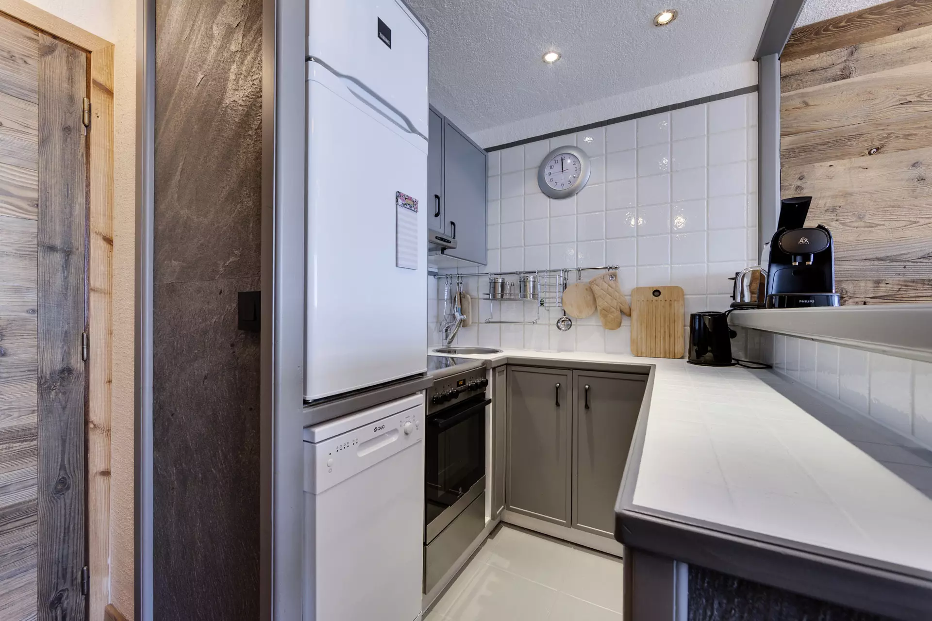 Cuisine ouverte équipée avec four, plaques de cuisson et lave-vaisselle