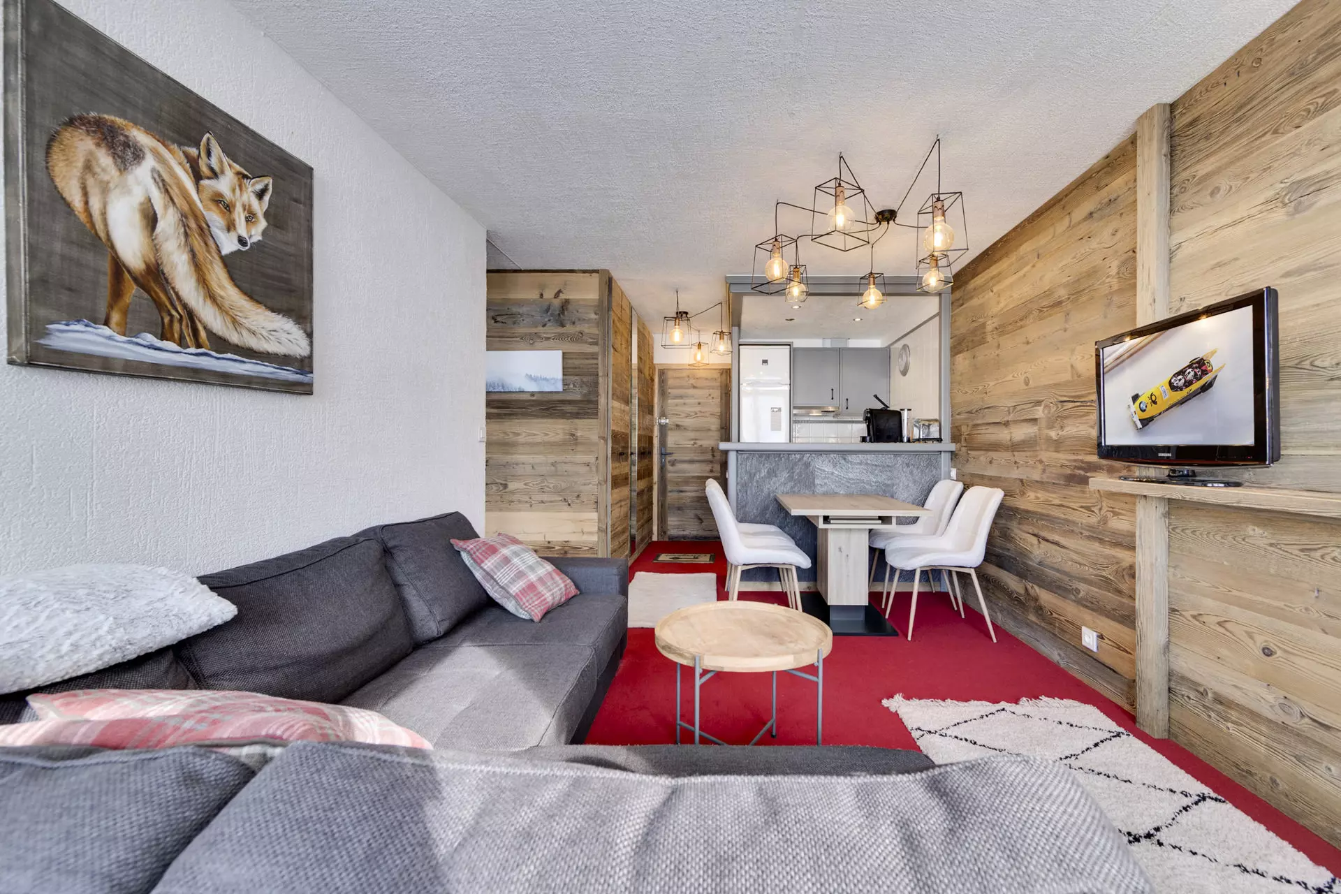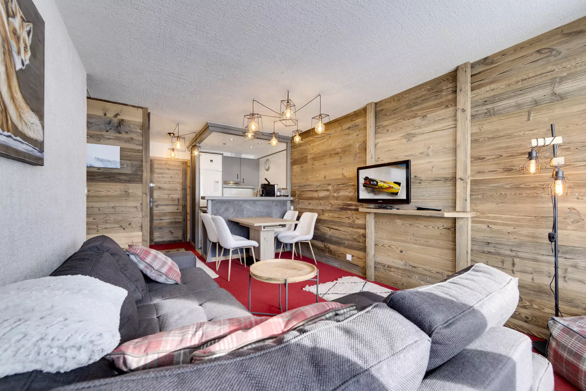 Séjour avec coin repas et salon avec canapé et téléviseur ouvrant sur une terrasse