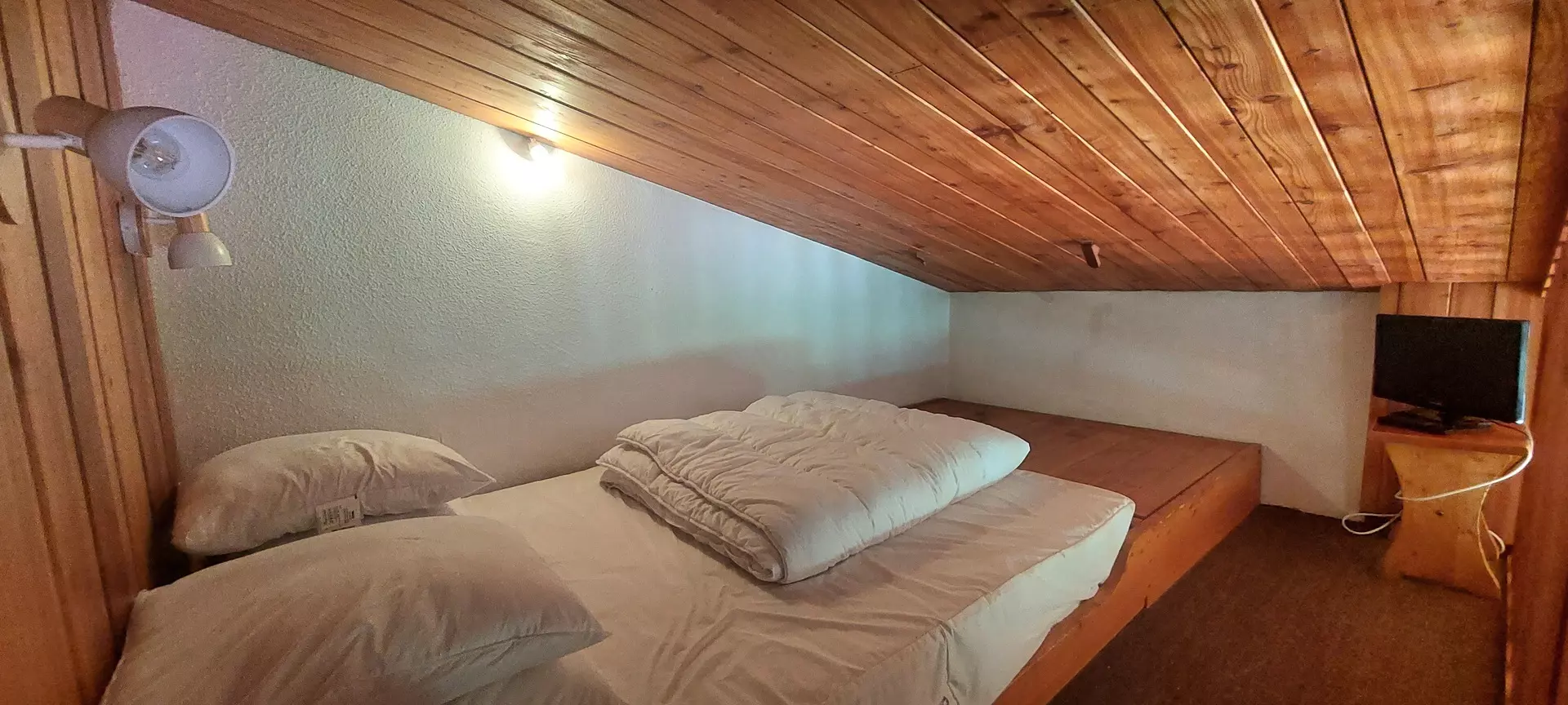 Une mezzanine au dessus du séjour avec un lit double et une TV (interdit aux enfants)