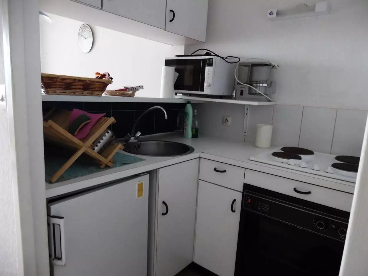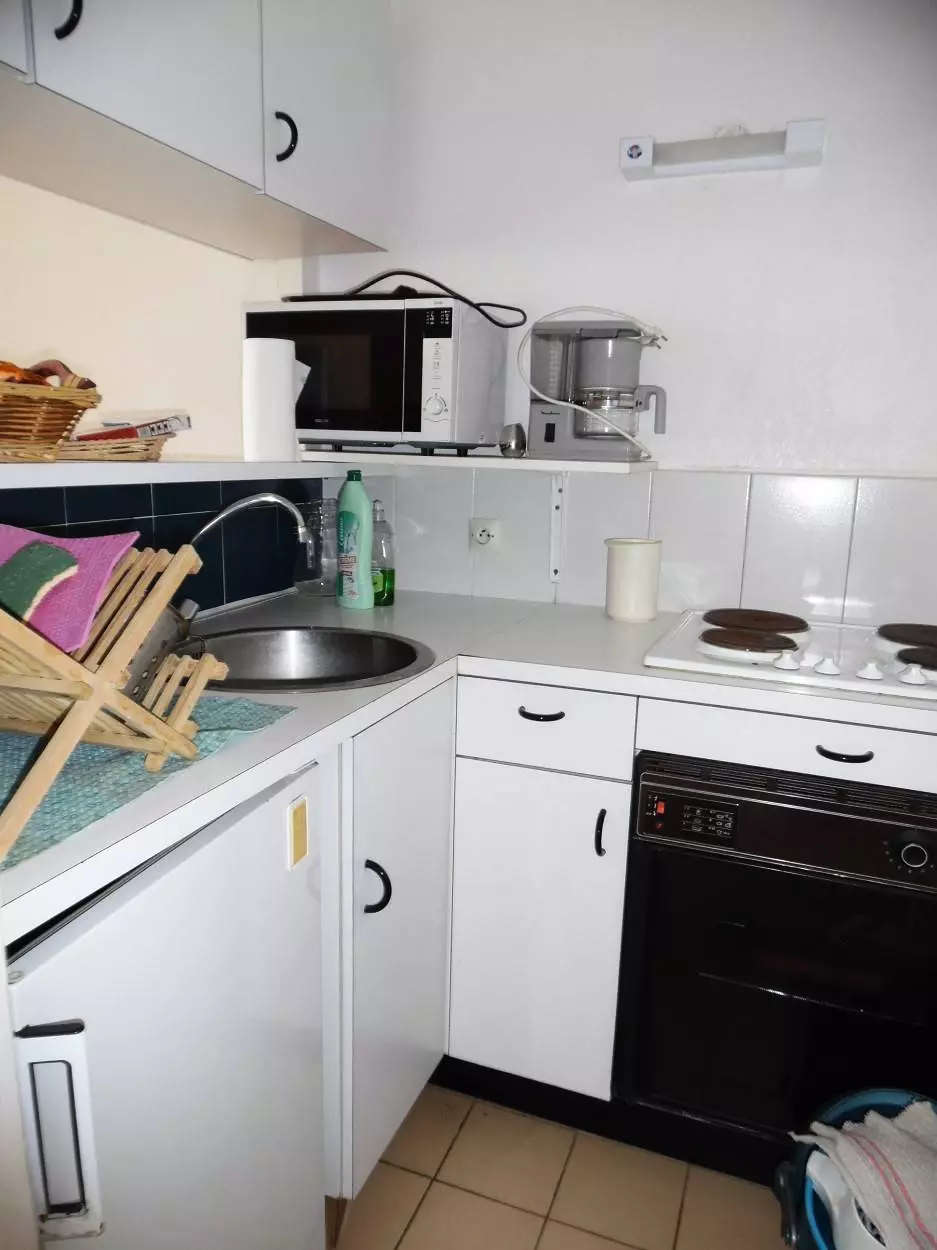La cuisine est équipée de plaques électriques, d'un four, d'un réfrigérateur et d'un micro-ondes.
