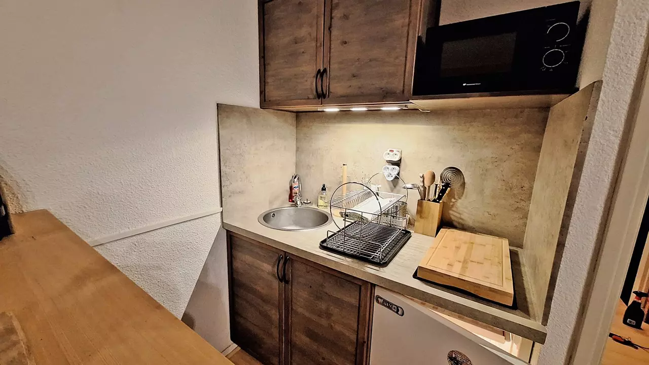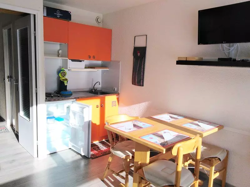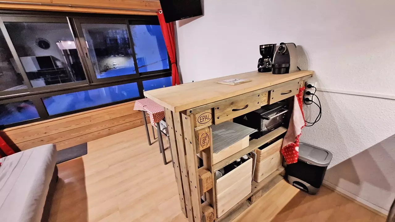 - La pièce principale est répartie en 2 espaces : le séjour avec un canapé-lit clic-clac et la kitchenette avec son coin repas
