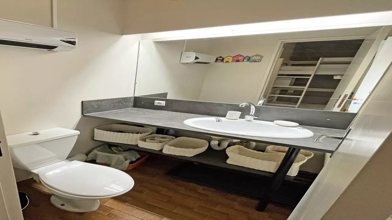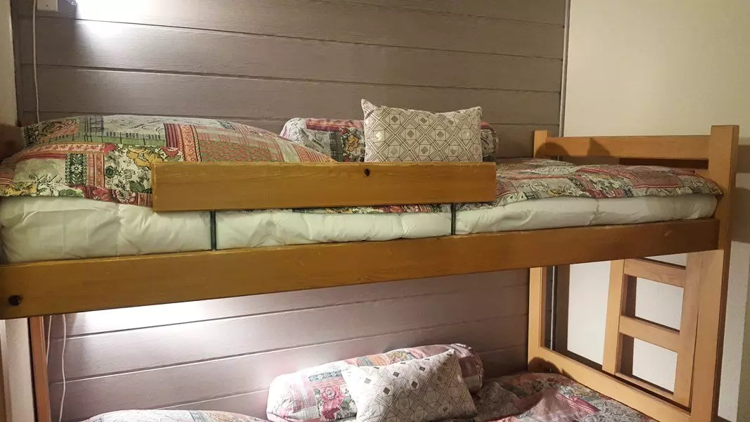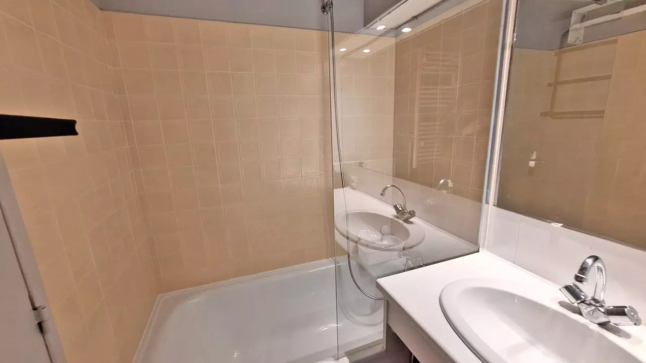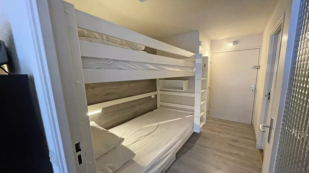 - Ce studio comporte une entrée avec le coin montagne et lit superposé, avec en face, la salle de bain avec WC.