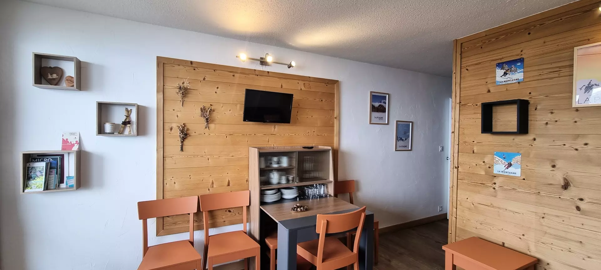 Le séjour comprend 1 canapé convertible (140*200), 2 lits superposés, une table pour 4 personnes et une télévision écran plat.