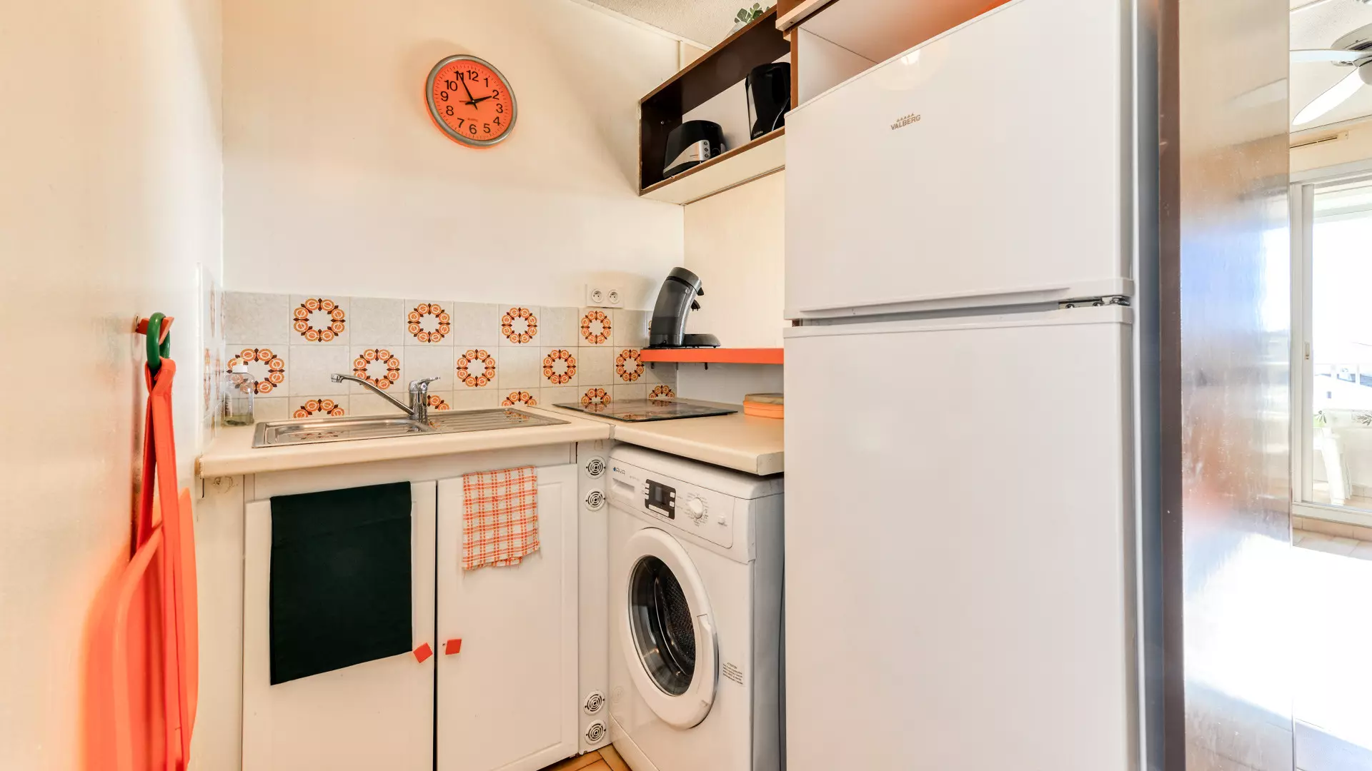 - Coin cuisine équipée : réfrigérateur, congélateur, micro-ondes, bouilloire, cafetière, vaisselle, couvert, grille pain, ustensiles de cuisine et lave-linge;