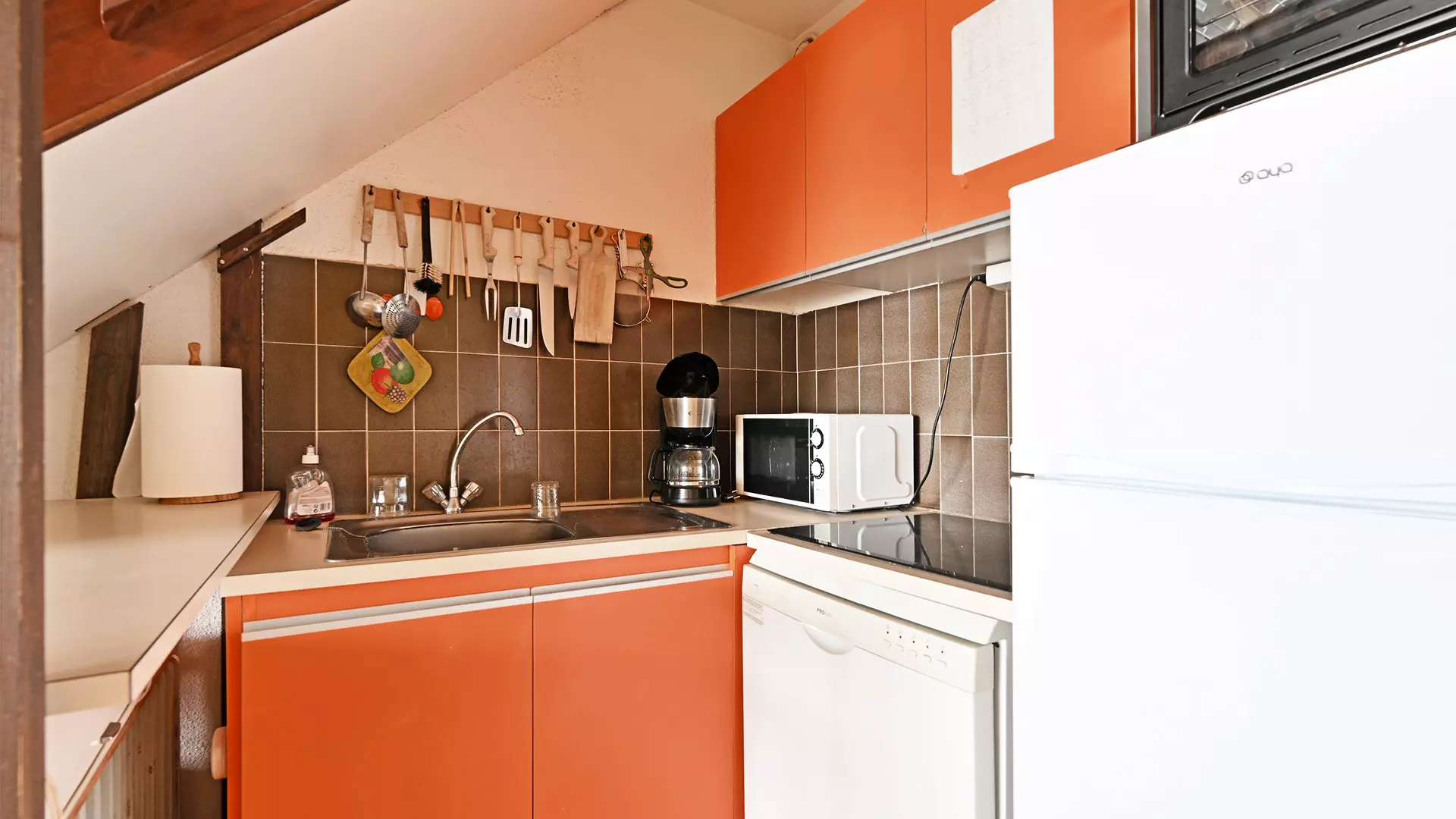 - Coin cuisine équipé (réfrigérateur, four, micro-ondes, lave-vaisselle, cafetière, vaisselle, couverts et ustensiles de cuisine;