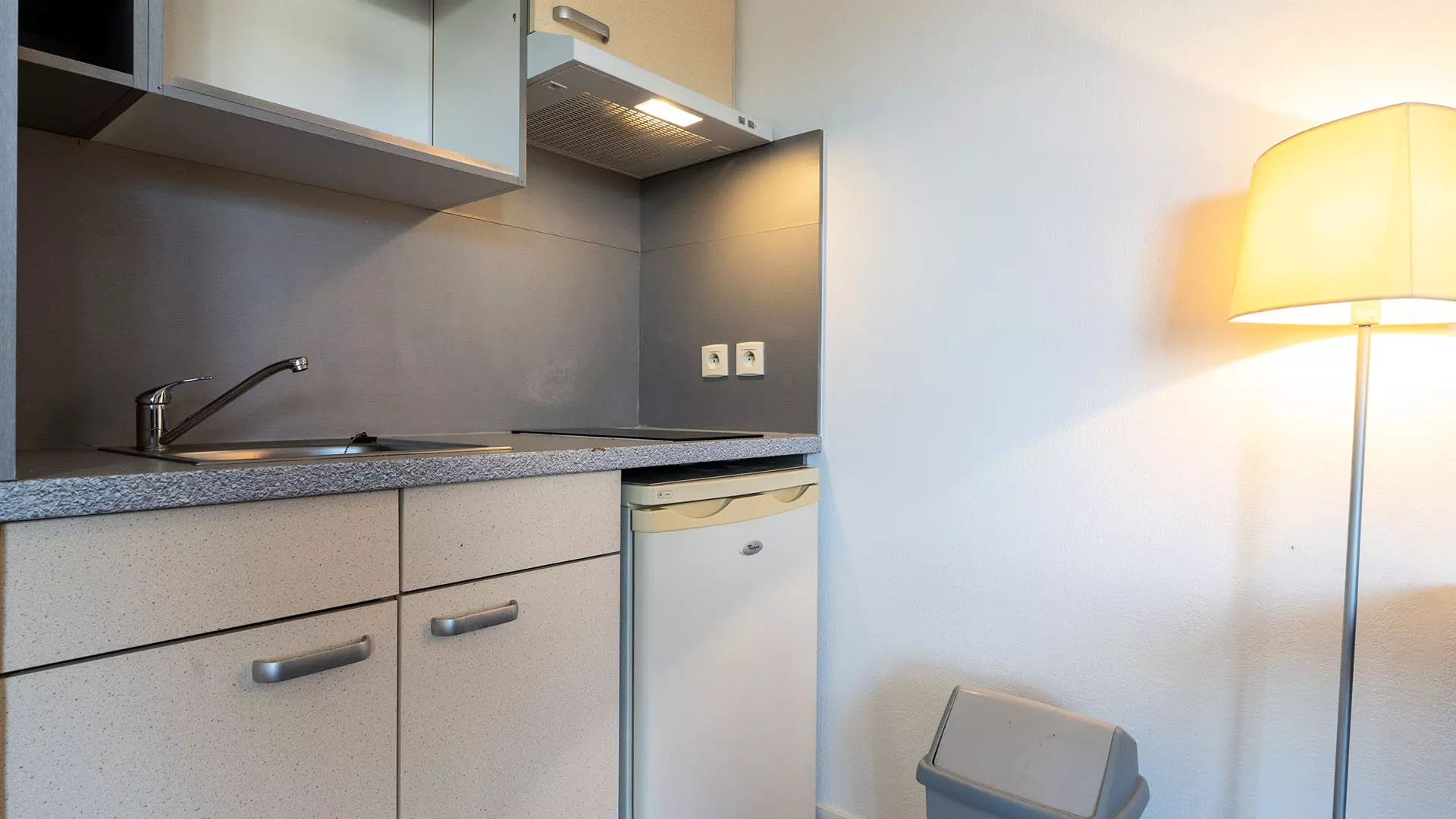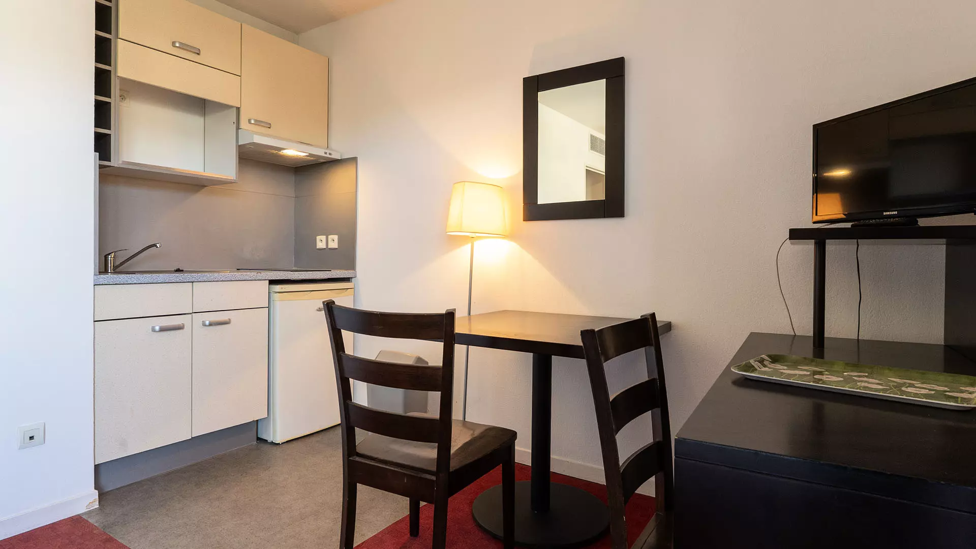 Cuisine : réfrigérateur, micro-ondes, vaisselle, couverts, cafetière et bouilloire