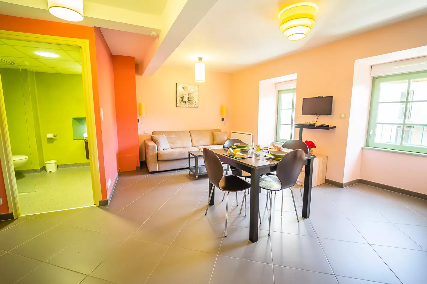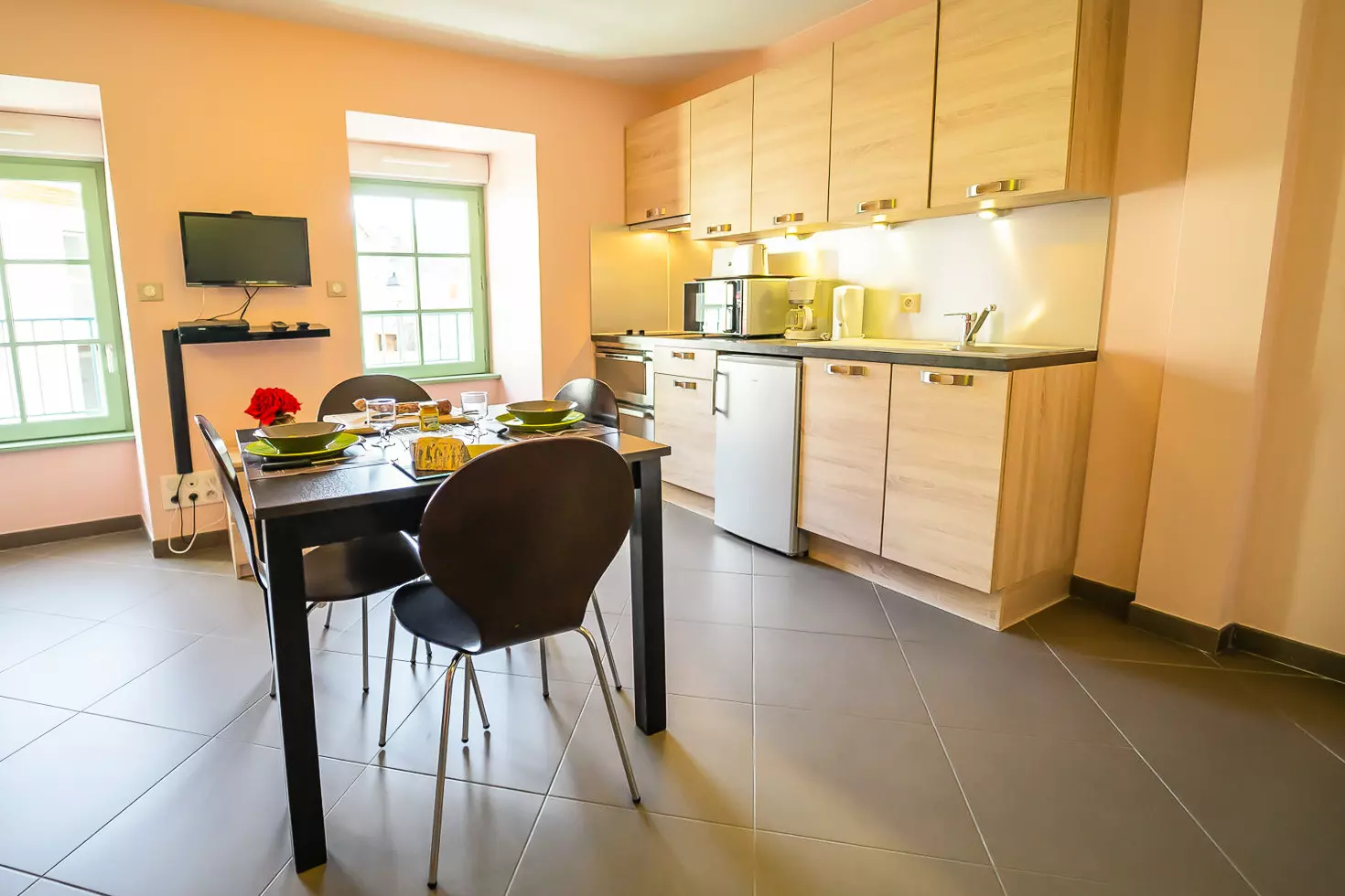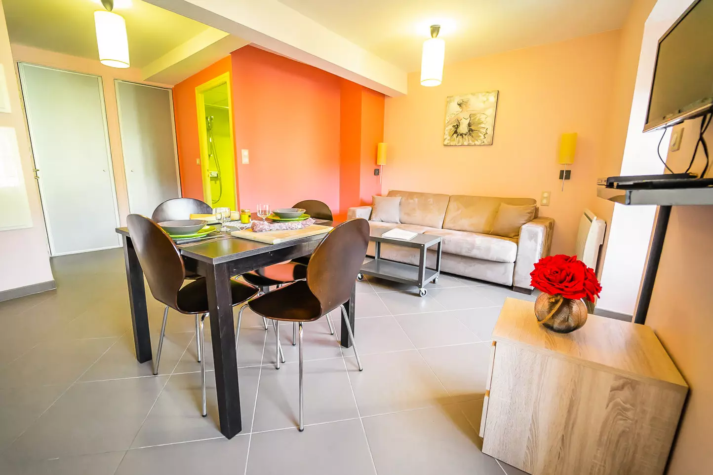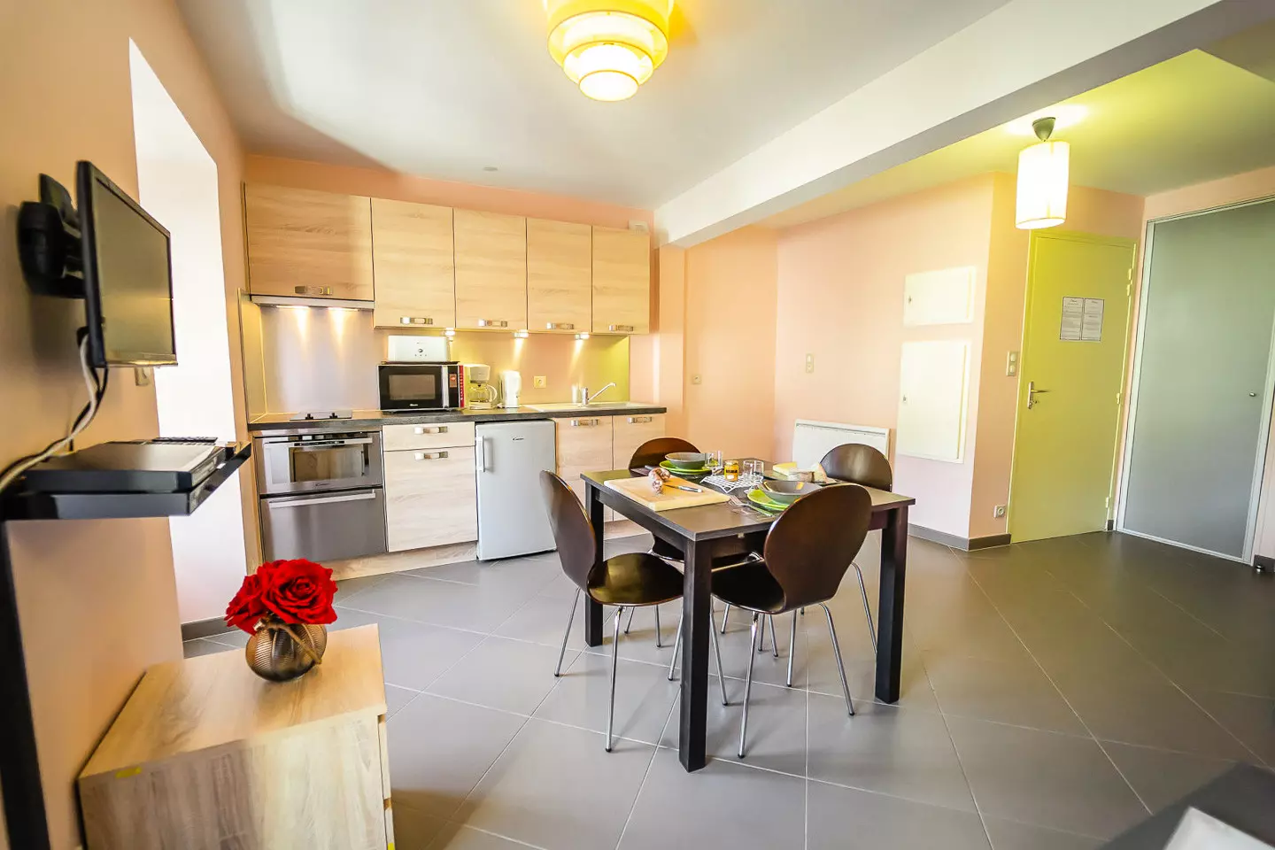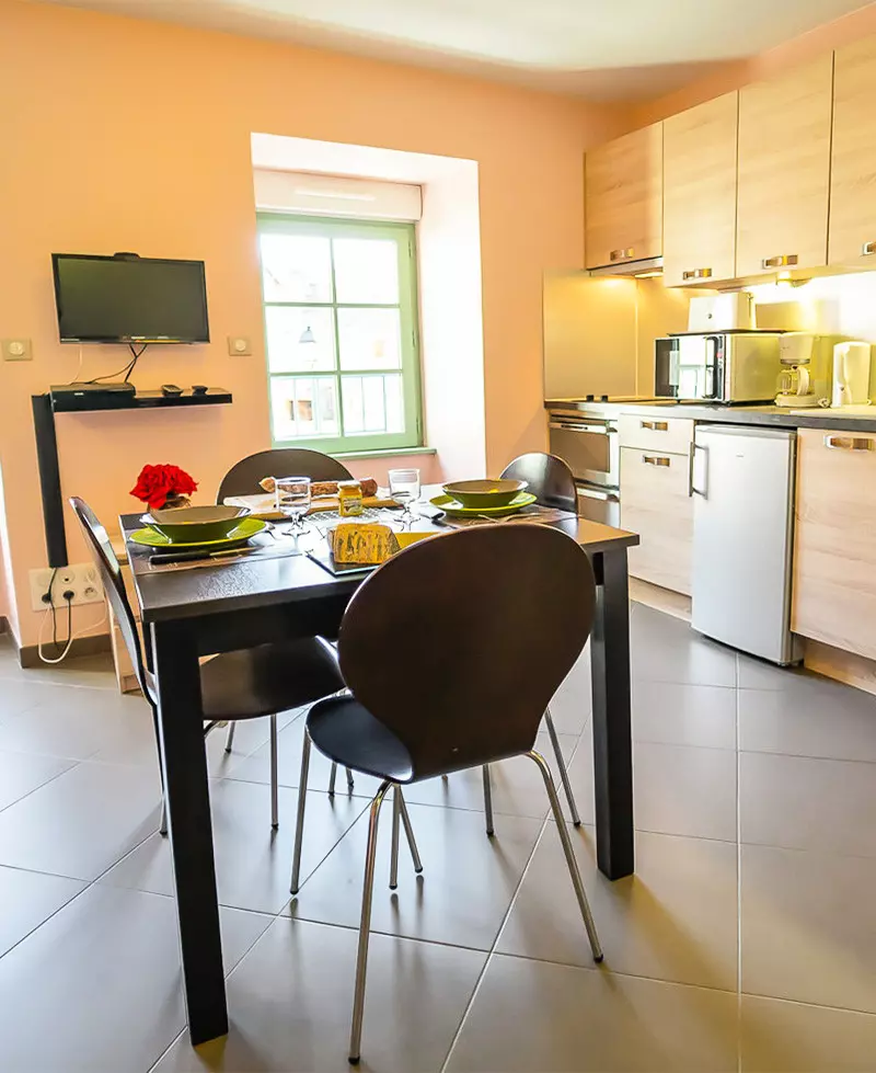 Appartement de 25 m² pour 2 personnes disposant d'un séjour (canapé-lit double 160x200 et télévision), d'un coin repas, d'un coin cuisine (2 plaques électriques, four, micro-ondes, réfrigérateur, bouilloire, grille-pain, cafetière et lave-vaisselle), d'une salle d'eau et d'un WC.