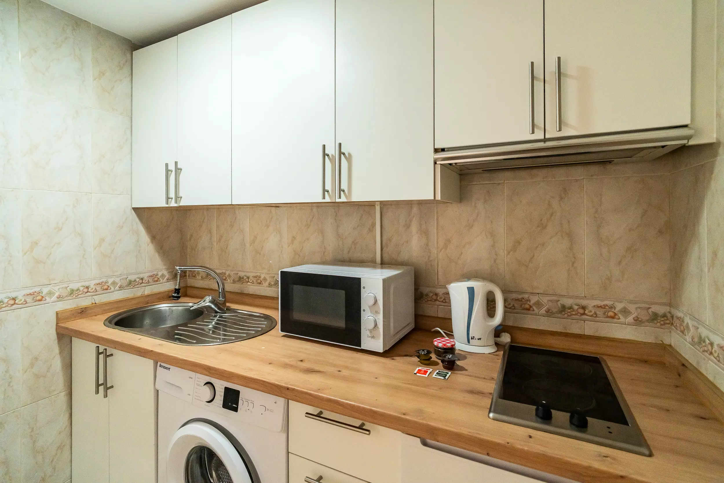 La cuisine indépendante, équipée d'une plaque vitrocéramique, d'un réfrigérateur, d'un four, d'un micro-ondes, d'un congélateur, d'une cafetière, d'un grille-pain, d'une bouilloire et d'un presse-agrumes, dispose également d'un lave-linge, offrant tout ce qui est nécessaire pour un séjour confortable, que ce soit pour de courts séjours ou des séjours plus longs.