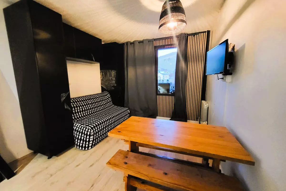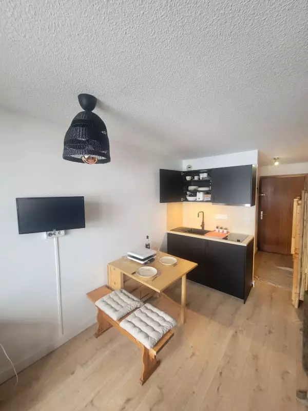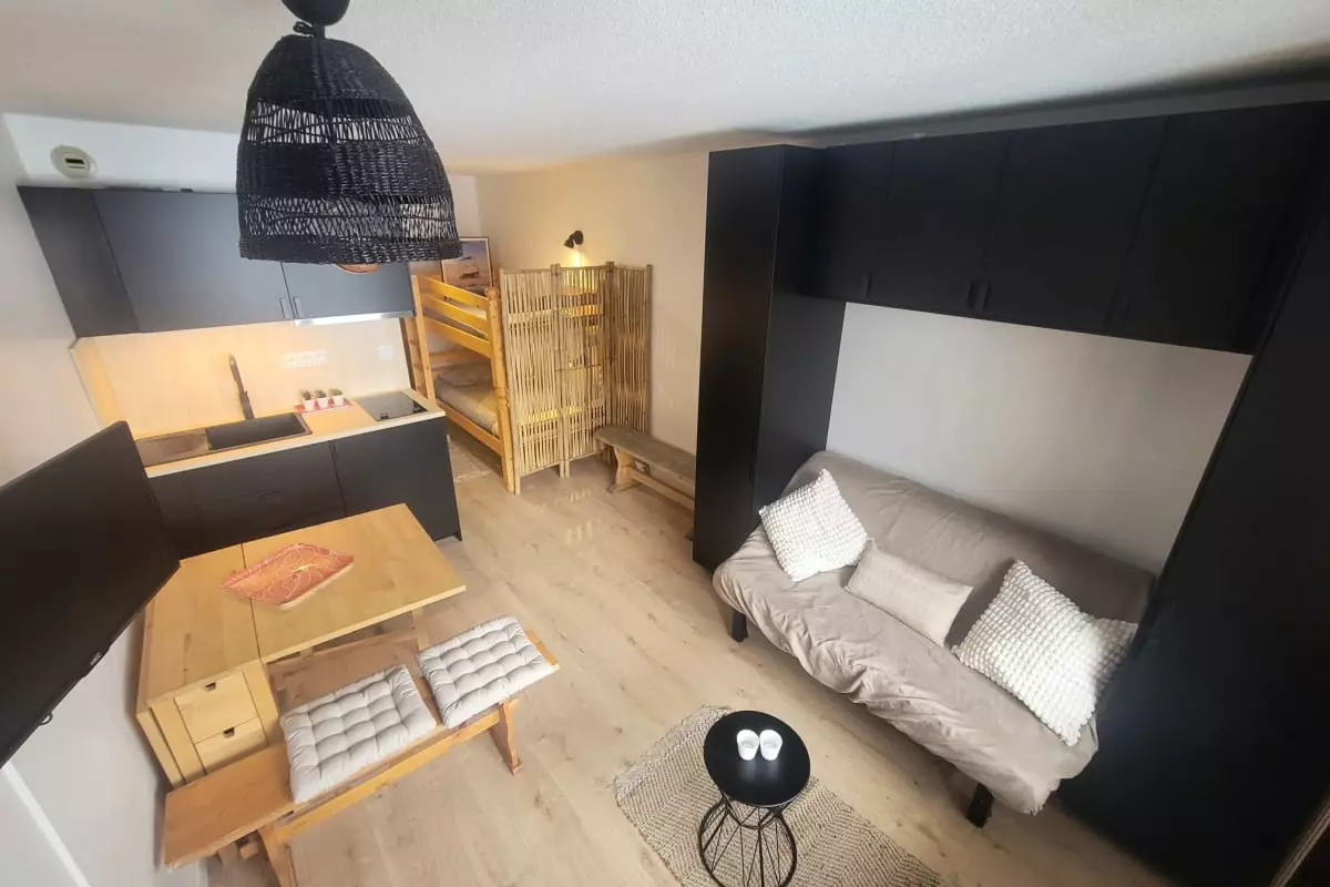 Joli studio moderne pour 4 personnes, aménagé avec goût, entièrement rénové. Très agréable à vivre, il est lumineux et offre une belle vue sur les remontées mécaniques et la station à Recoin. Vous profiterez d'un espace " Cosy" et moderne avec un coin nuit comprenant 2 lits superposés, un BZ de 140 dans le séjour. Cuisine neuve et équipée avec rangements, salle de bain avec douche. Espace salon avec tv. Balcon.