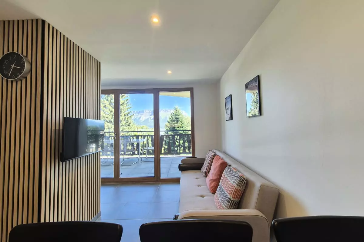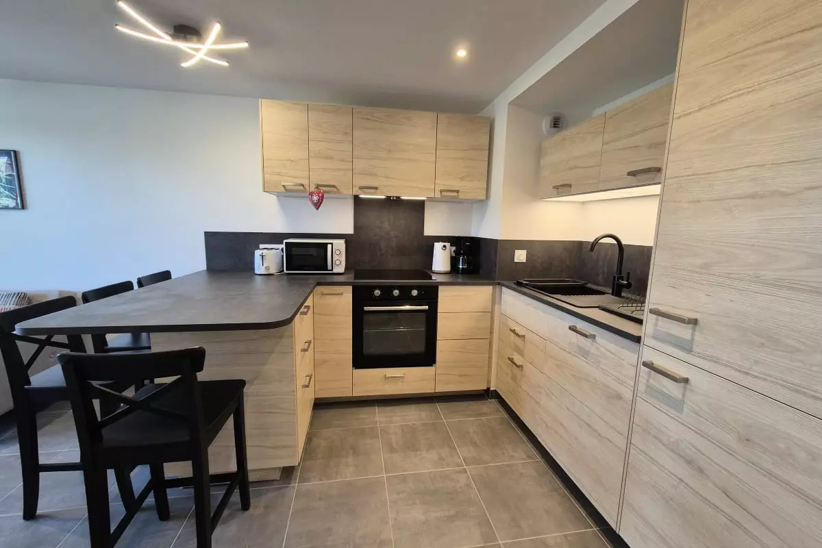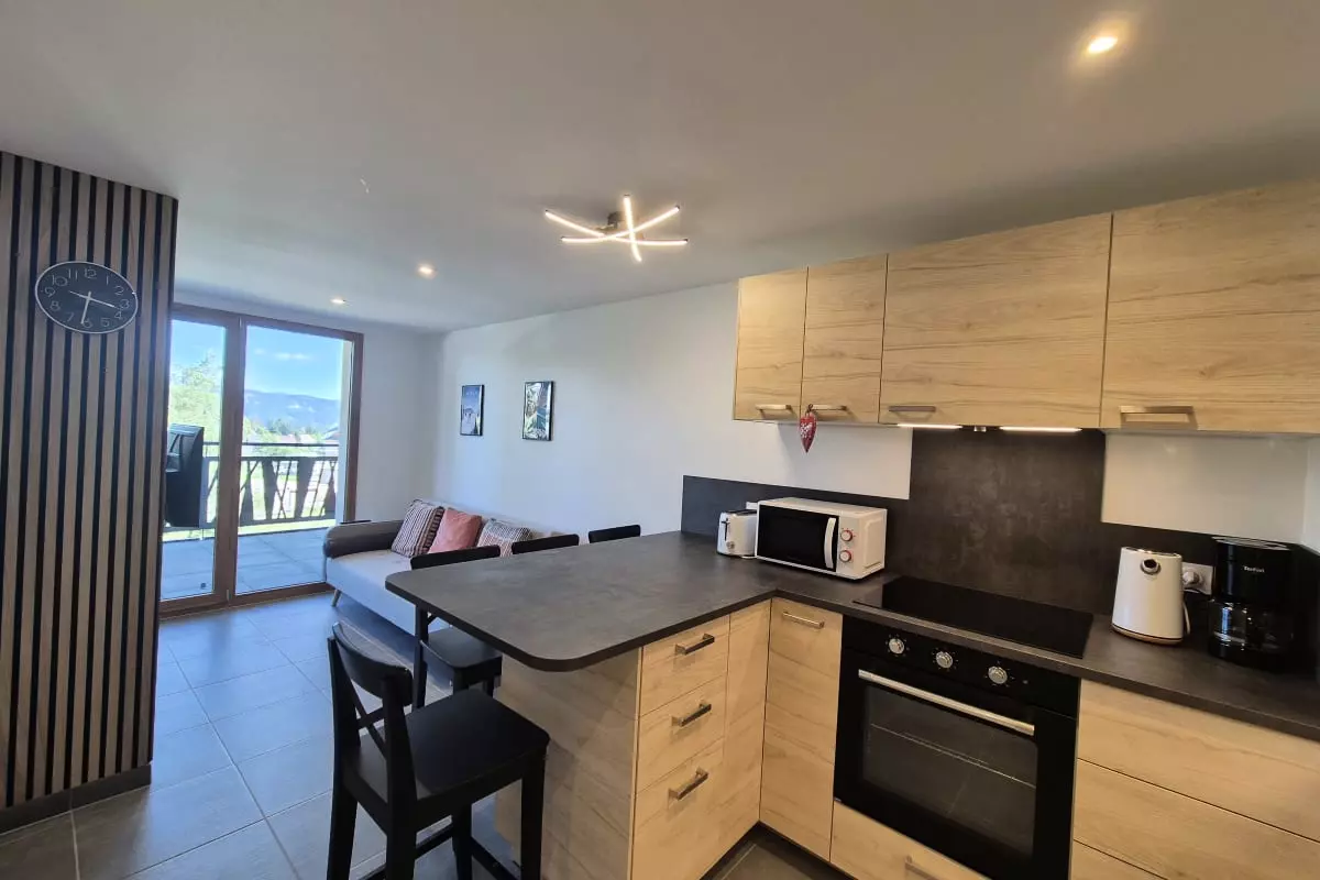 La cuisine entièrement équipée, avec lave-vaisselle et four, vous permettra de préparer de délicieux repas après une journée en plein air. Le séjour, très lumineux s'ouvre sur un grand balcon où vous pourrez savourer votre café du matin tout en admirant une vue à couper le souffle sur les montagnes.