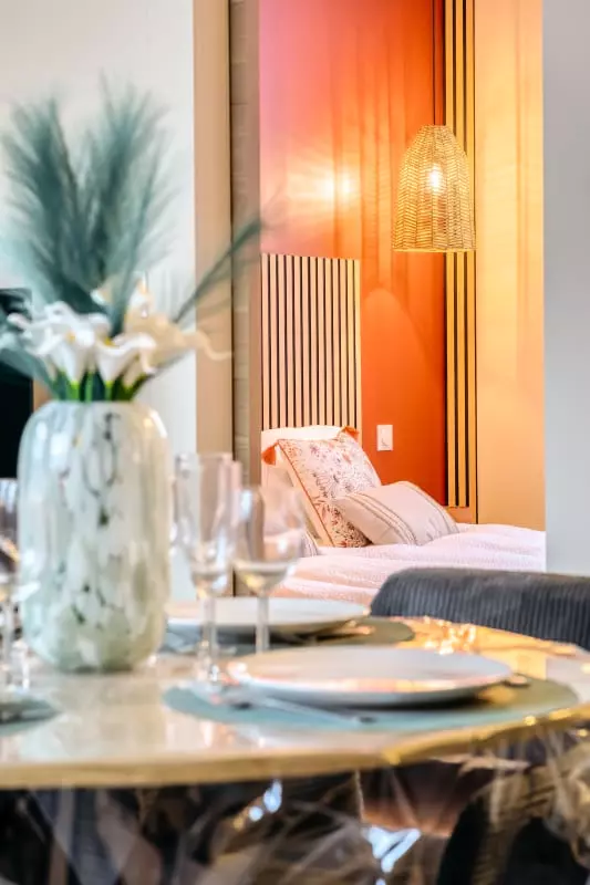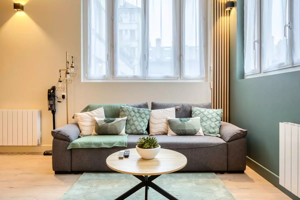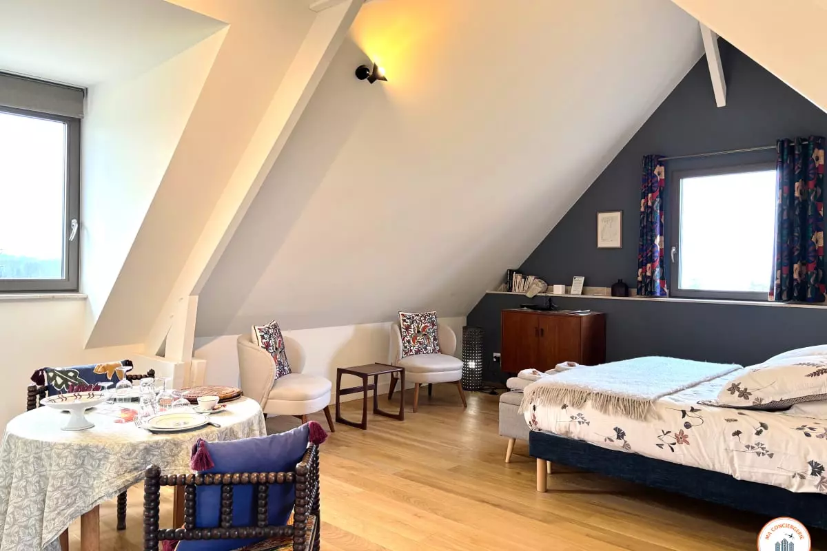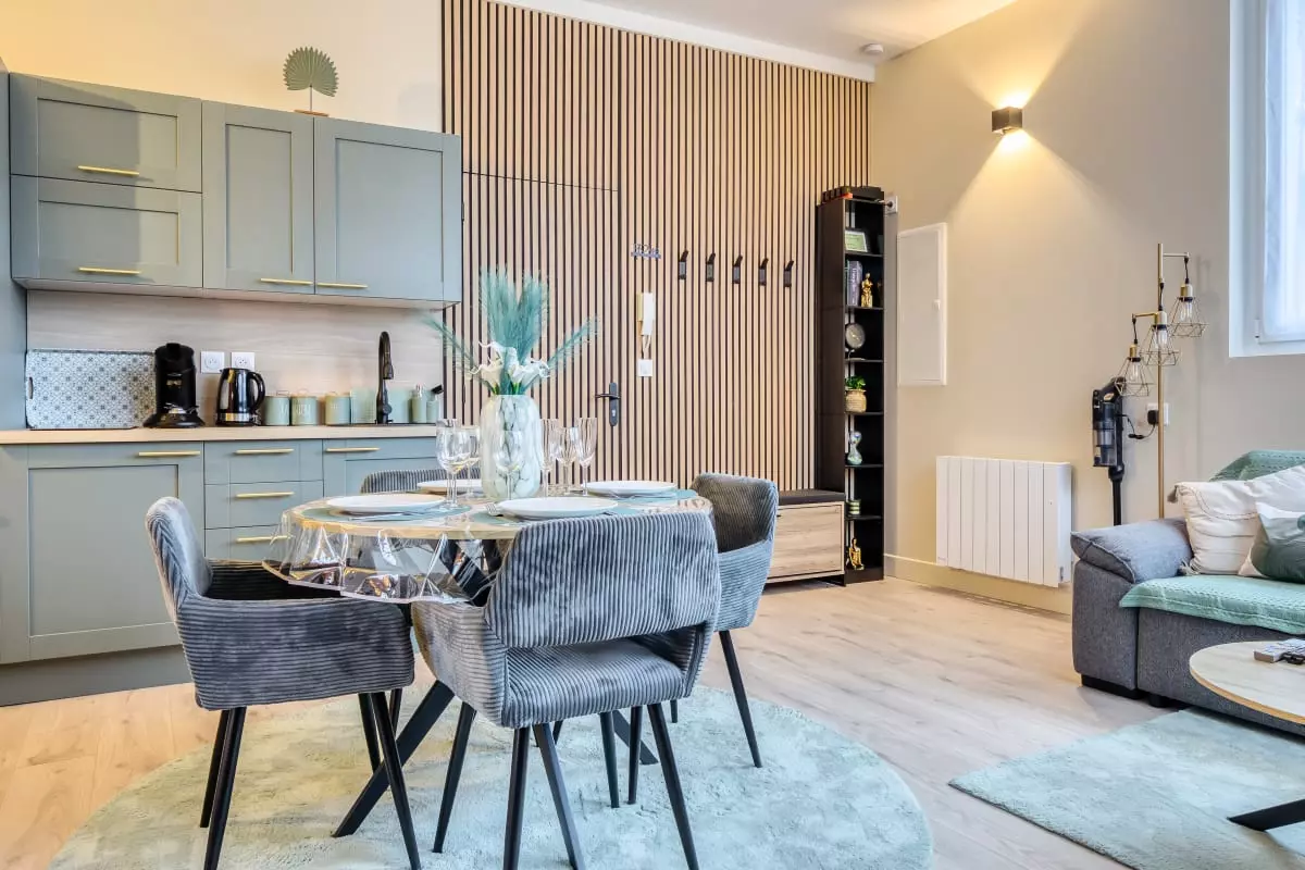 En poussant la porte, vous découvrez un séjour chaleureux où l’on a envie de ralentir et de poser ses valises. Un coin repas vous attend pour partager un petit-déjeuner ou un dîner à quatre, tandis qu’un canapé confortable, convertible en couchage d’appoint (linge de maison et de lit disponible pour le deuxième couchage sur simple demande à notre conciergerie en supplément à 12€), fait face à la télévision pour vos soirées détente. La lumière glisse le long des murs pastel et donne au lieu une ambiance douce, propice au repos après une journée de travail ou de visites.