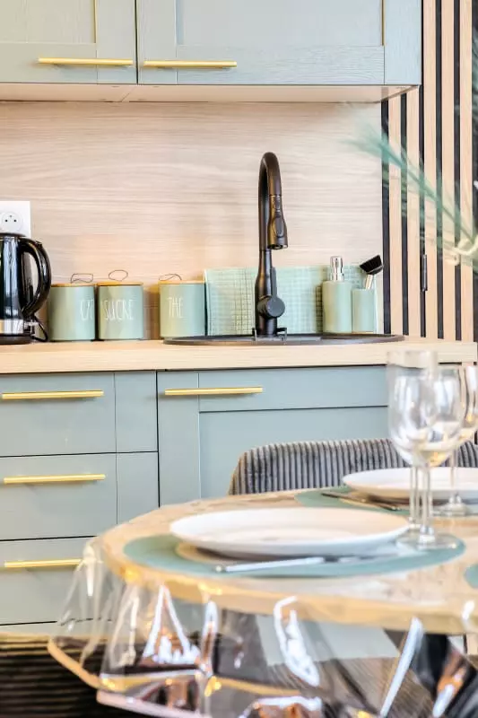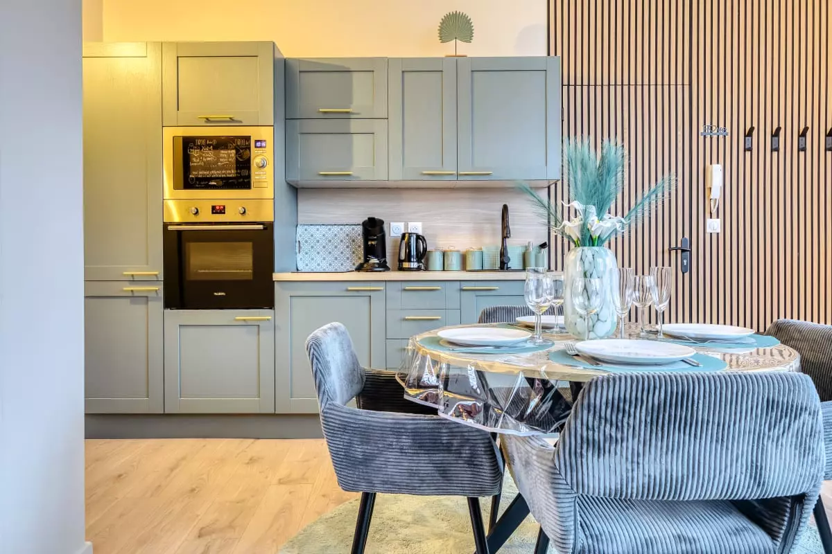 Ouverte sur le salon, la cuisine entièrement aménagée vous permet de vivre en parfaite autonomie : four, micro-ondes, réfrigérateur, cafetière Senseo, bouilloire et grille-pain sont à votre disposition pour préparer un café au réveil, un plateau apéro ou un repas complet. Tout est pensé pour que vous vous sentiez ici comme chez vous, le temps de quelques jours ou davantage.