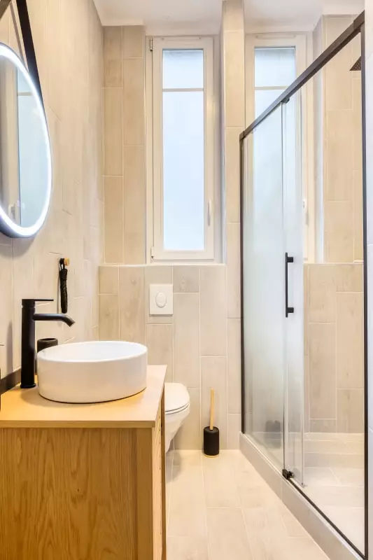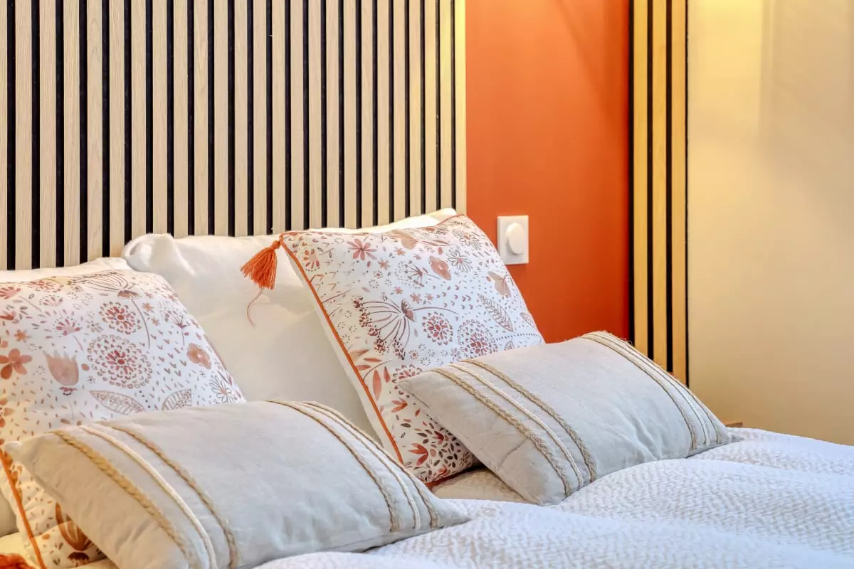 La chambre indépendante, aux tons terracotta, vous offre un lit 160x200 cm dans lequel vous n’aurez plus envie de quitter les draps. Une penderie vous permet de ranger vos affaires et de vous installer confortablement, que vous soyez en déplacement professionnel ou en escapade romantique. La salle de douche, moderne et fonctionnelle, comprend les WC ainsi qu’une machine à laver le linge, très pratique pour les séjours prolongés. Du matériel de repassage est également à votre disposition. Le linge de lit et de maison est fourni pour que vous puissiez voyager léger.