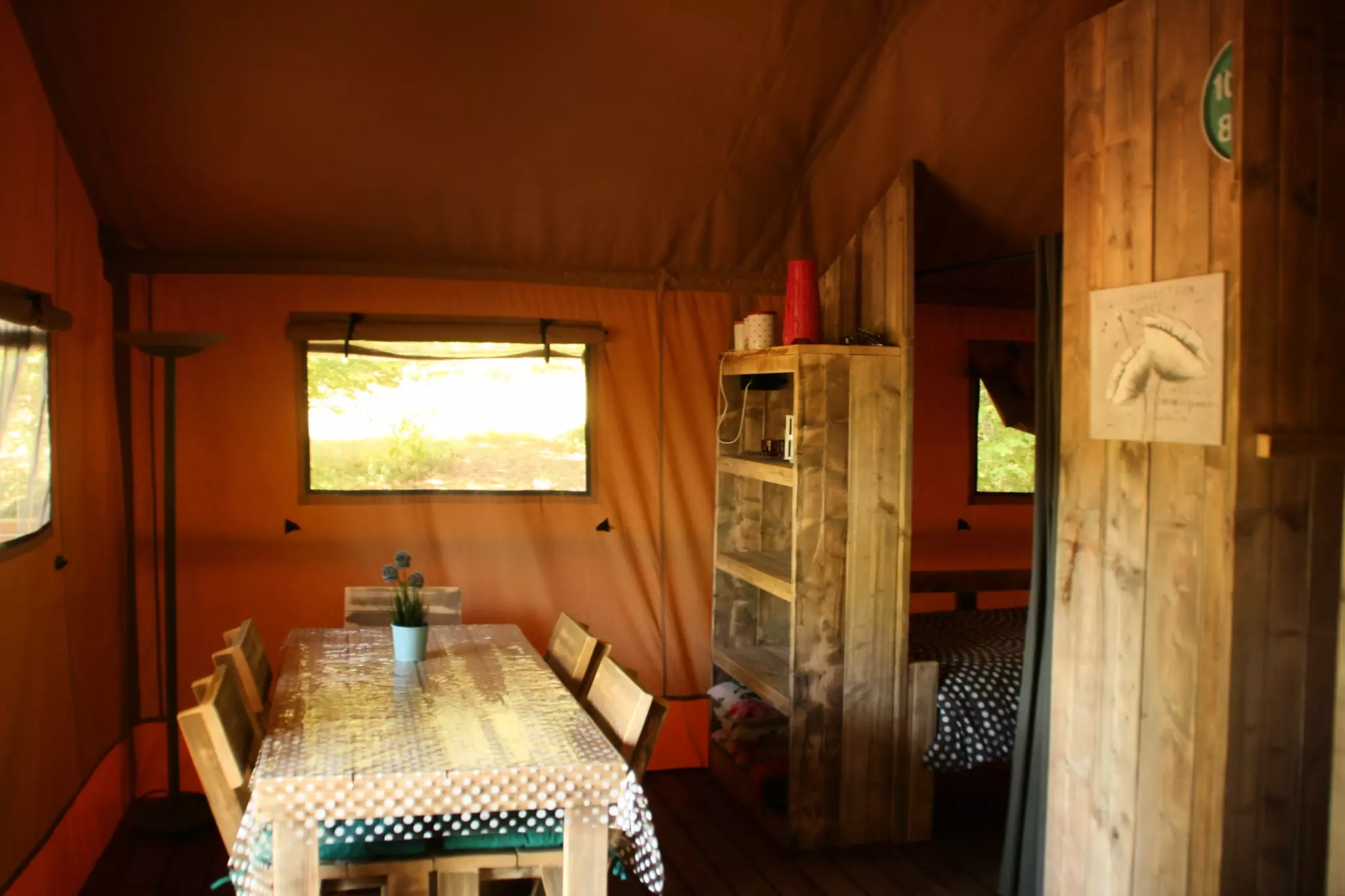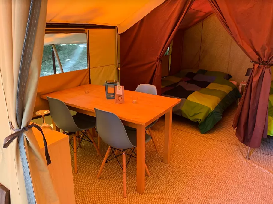 Tente Family 3* pour 5 personns, hébergement insolite avec des meubles en bois, situé dans un endroit spacieux et calme du camping. Idéale pour des vacances en famille. Kit bébé offet (Lit + chaise haute).