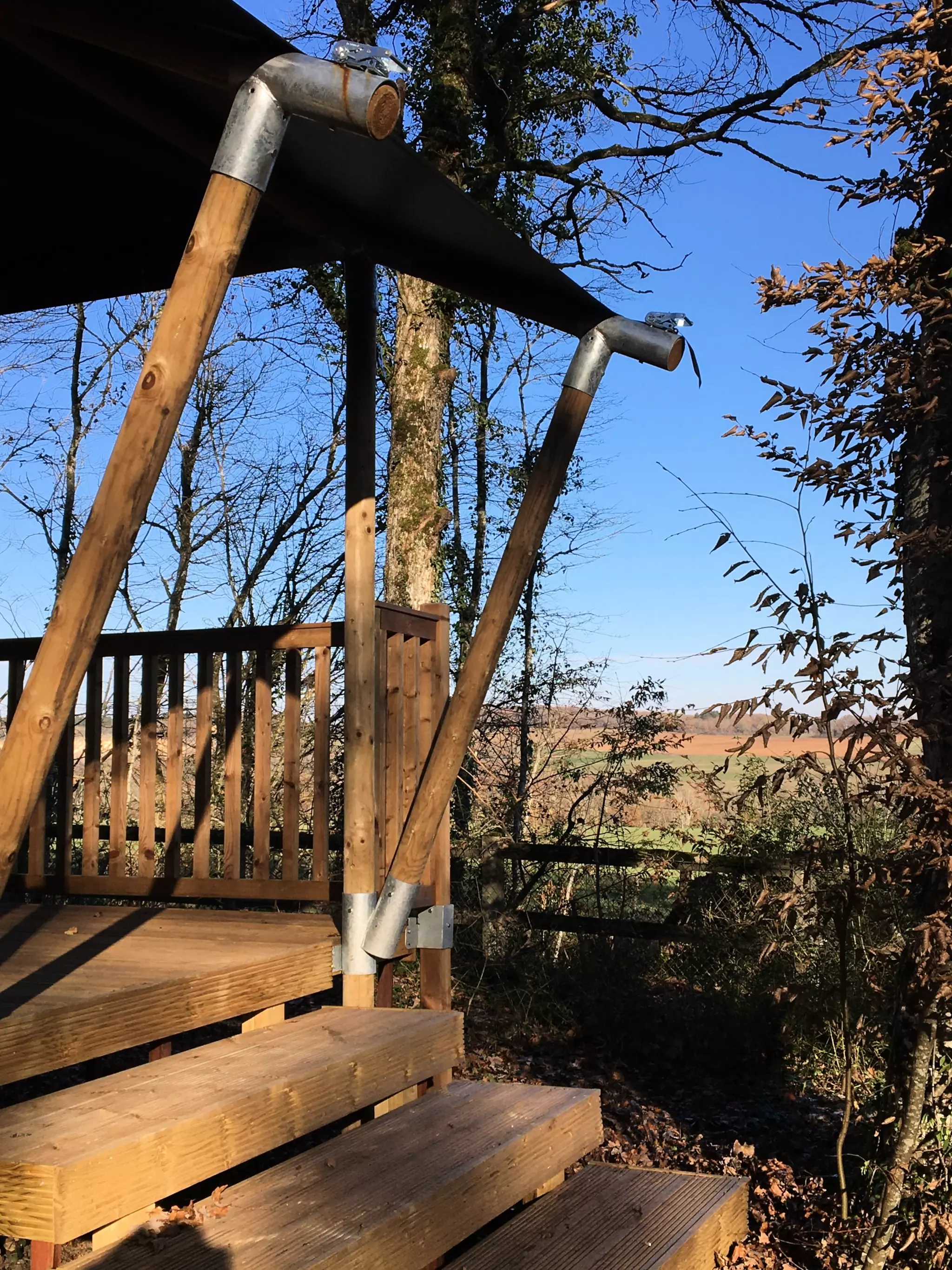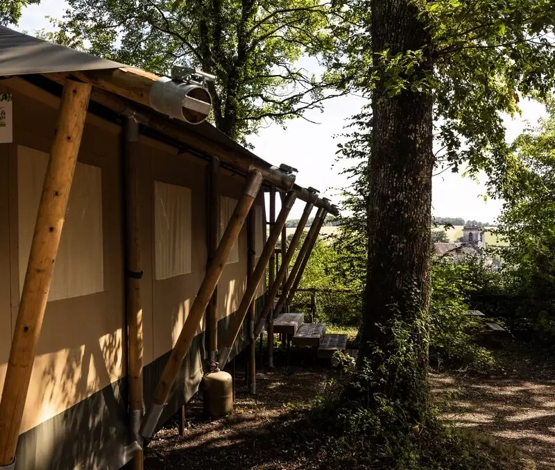 Tente Insolite Nature 2* : Vue campagne, 20 m2, avec terrasse bois semi-couverte, avec chaise berçante et superbe vue sur la vallée.