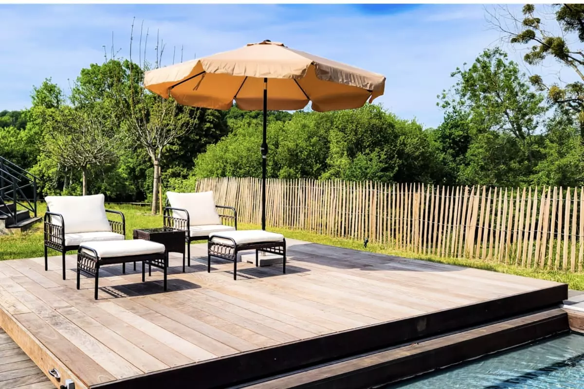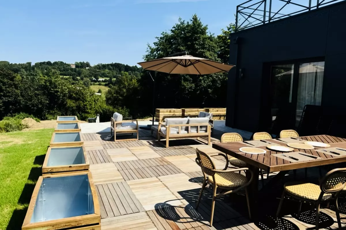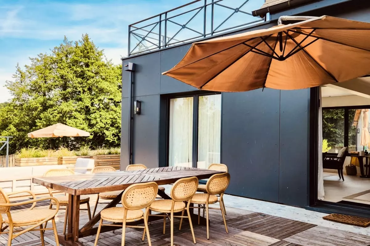 - grandes terrasses avec table à manger, salons de jardins, chaises longues et parasols pour se détendre au soleil,