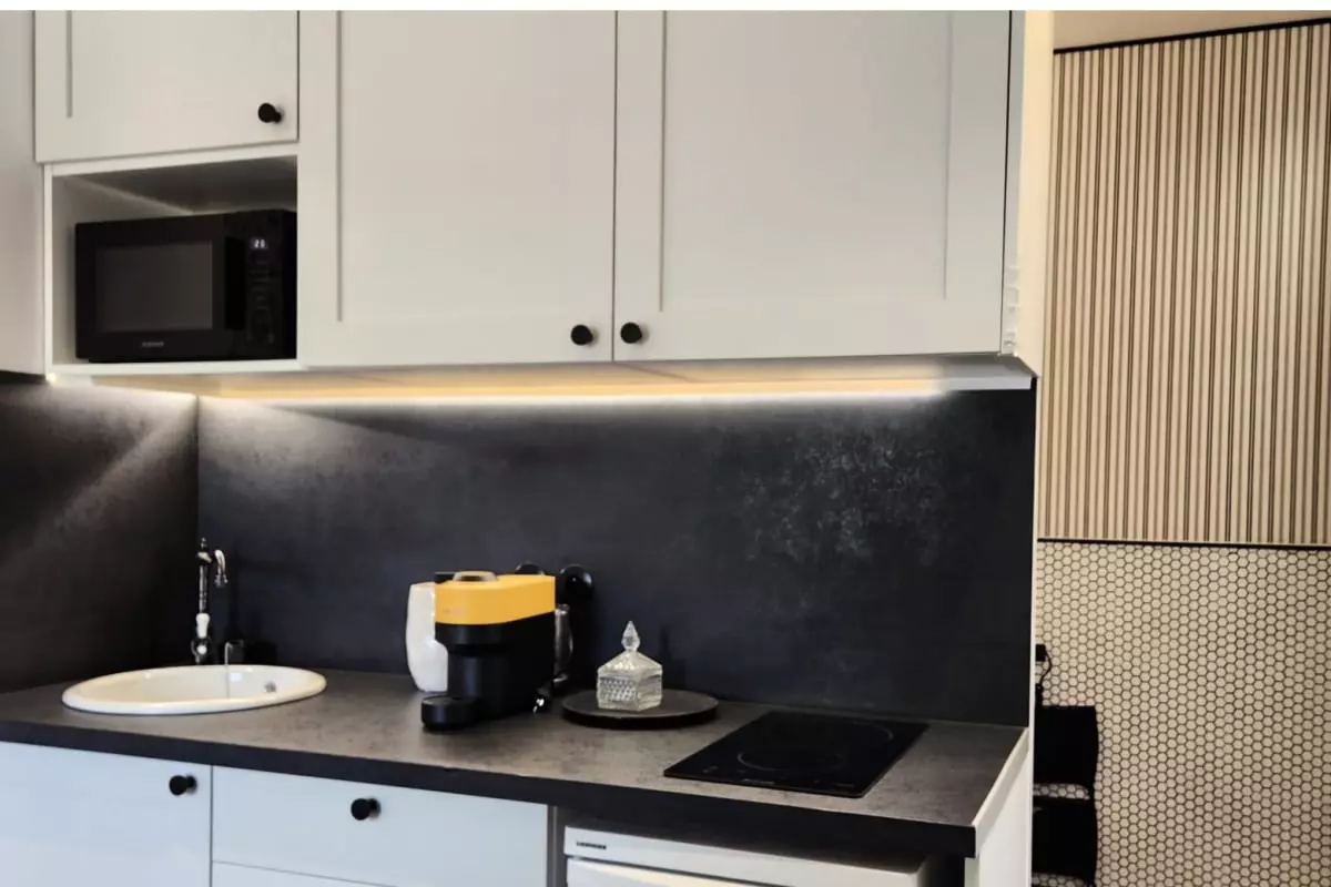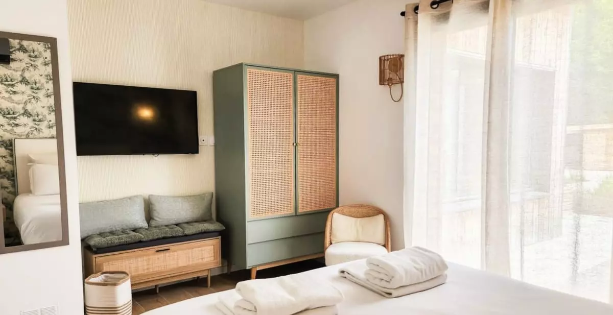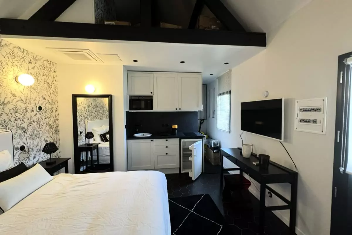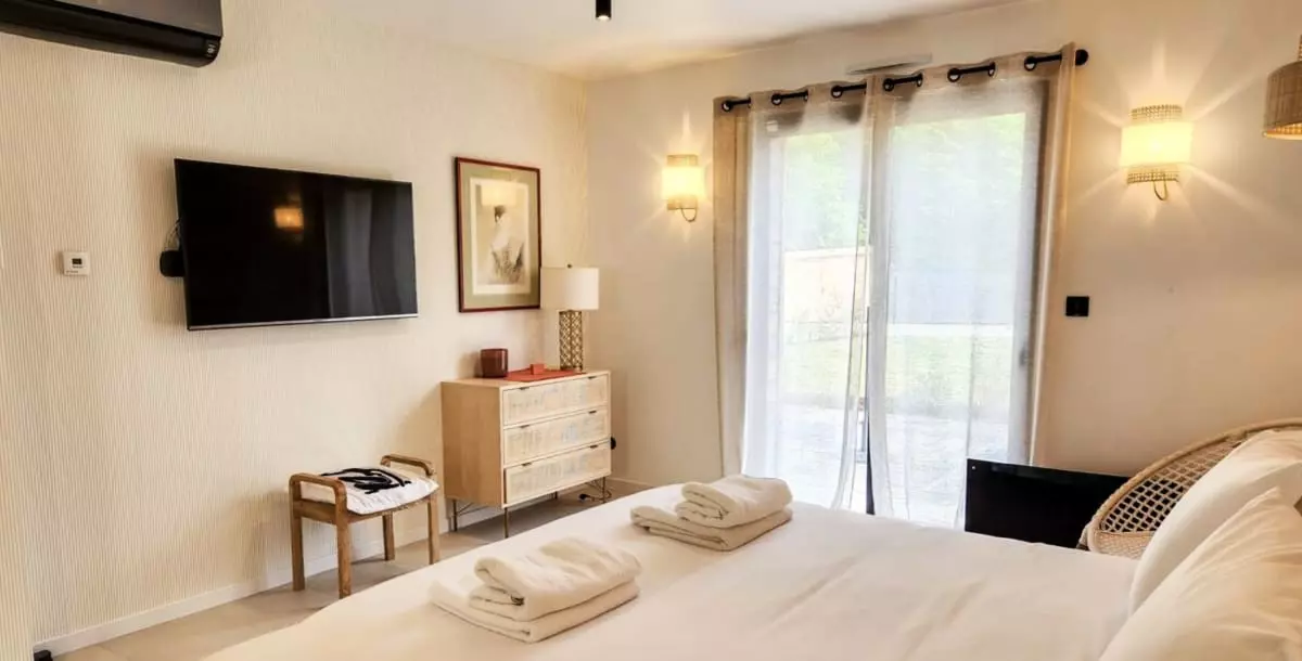 - en dépendance, un studio charmant de 26 m² offrant intimité et confort, équipé d'un lit double 160x200, d'une kitchenette (micro-ondes, cafetière, etc.), d'une TV, et d'une salle de douches avec WC,