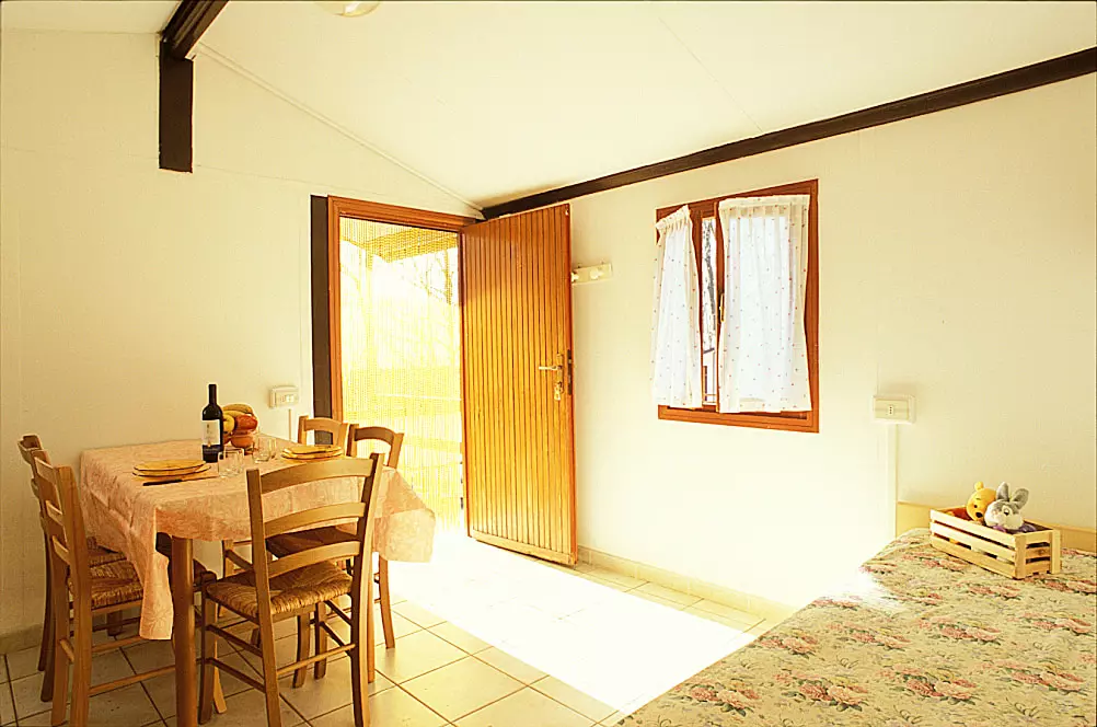 mobilhome ( 8 x 3 square metres) with two bedrooms ( one with double bed and one with single beds) and livingroom with cooking corner with four fires,big fridge, table and chairs, airconditioning and SAT TV. in some mobilhomes the fifth bed can be in the livingroom.