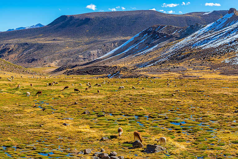 Passage à proximité du volcan Chachani et observation des vigognes dans la réserve de Salinas y Aguada Blanca. Découverte au passage des paysages lunaires, notamment au col de Pata Pampa à 4900m d’altitude.
