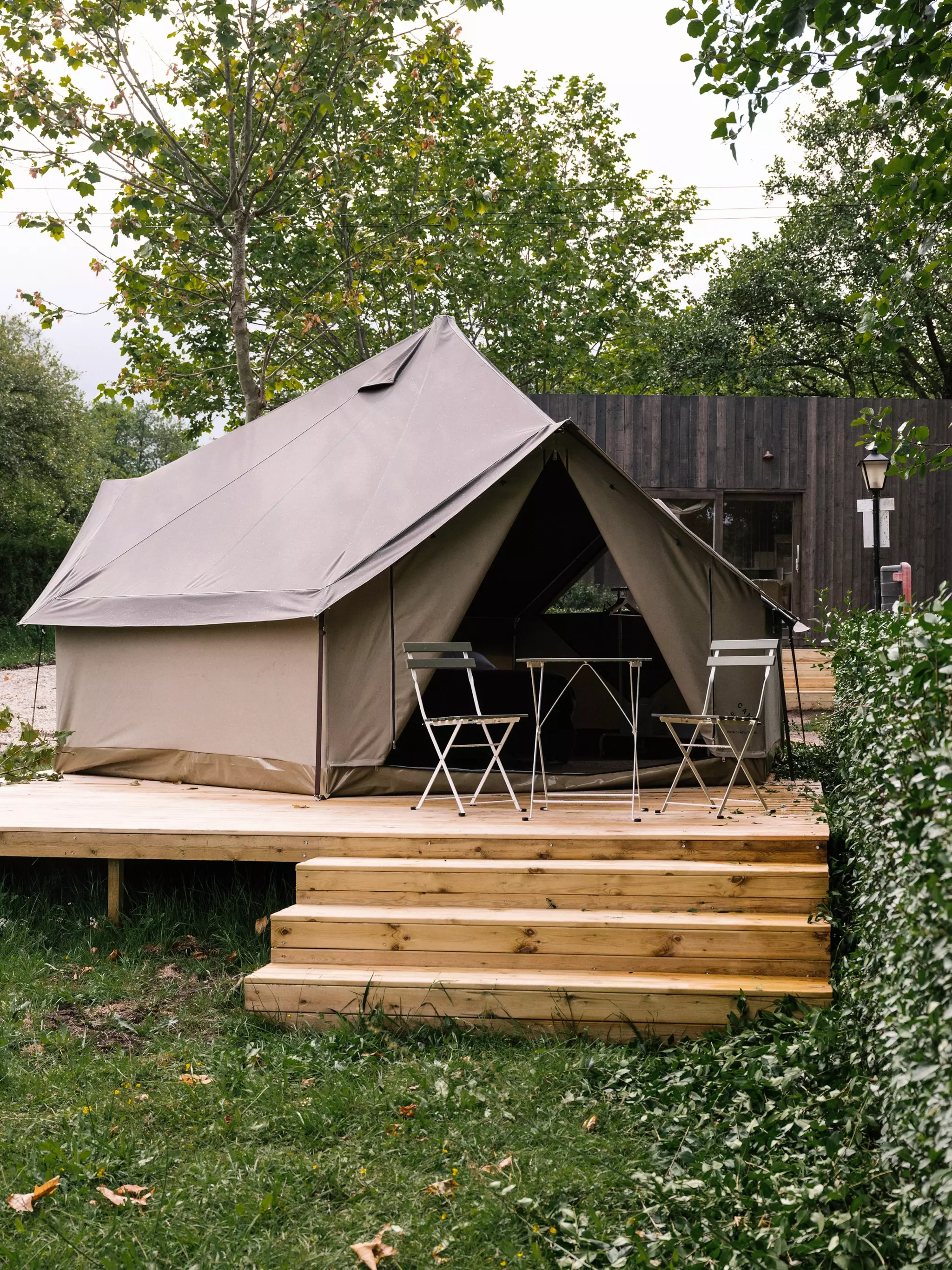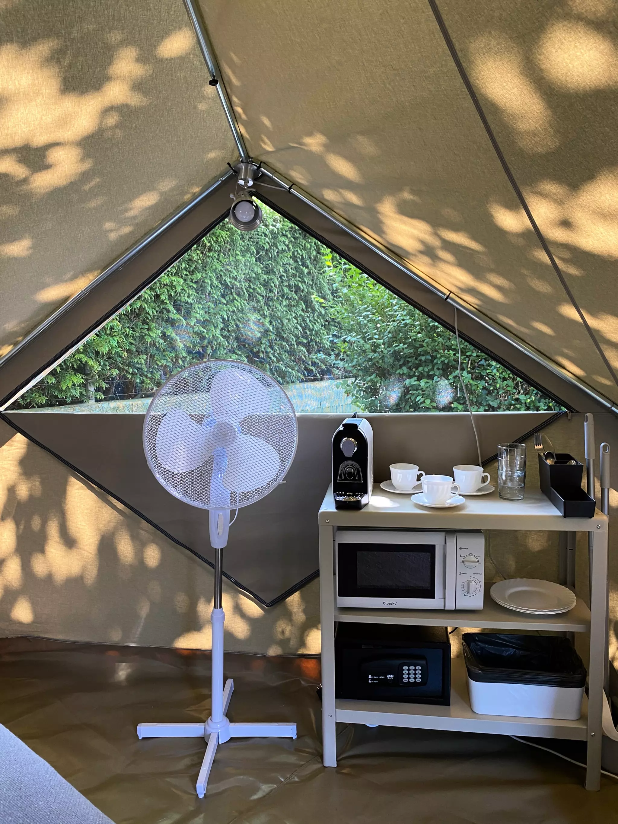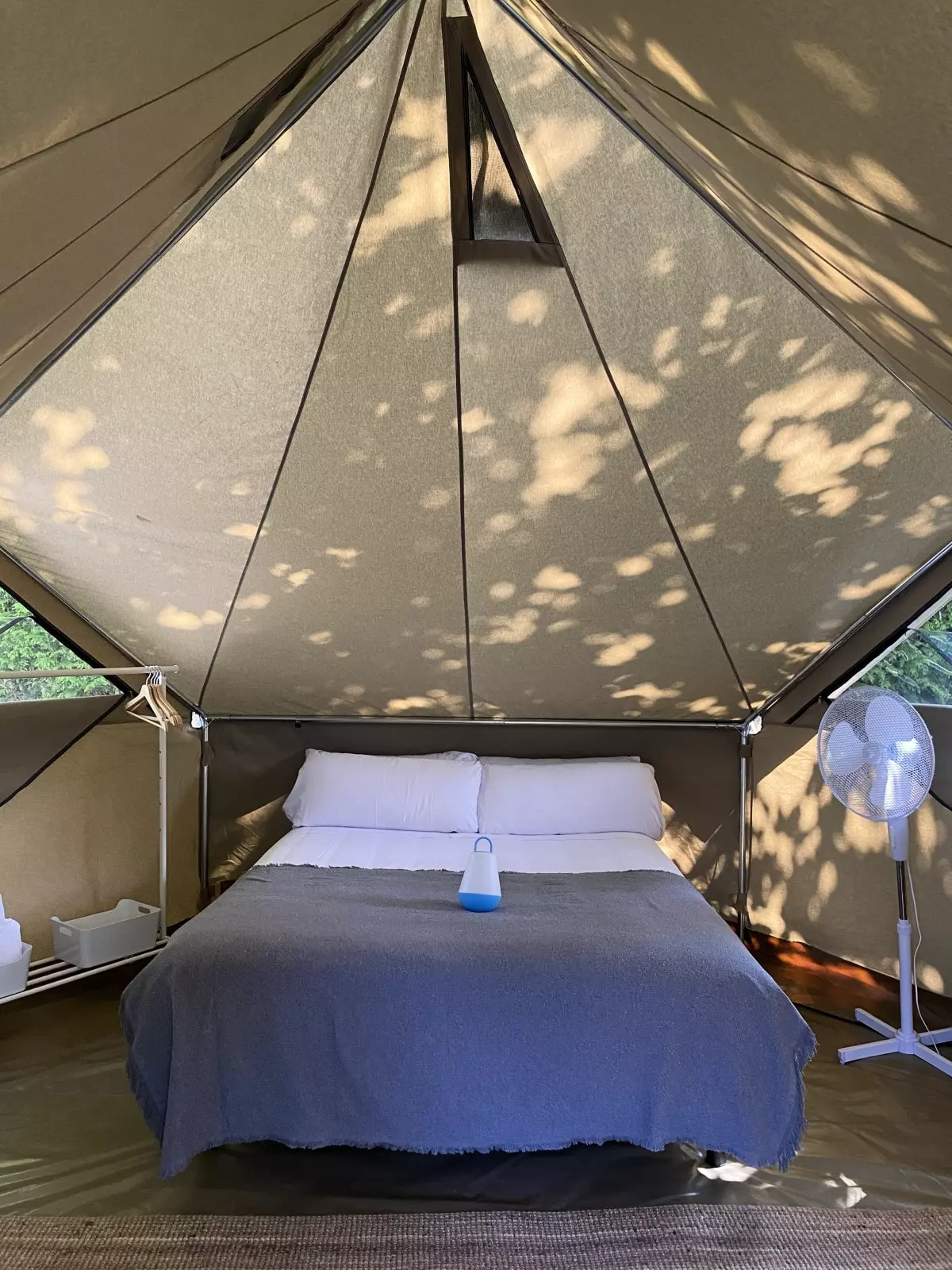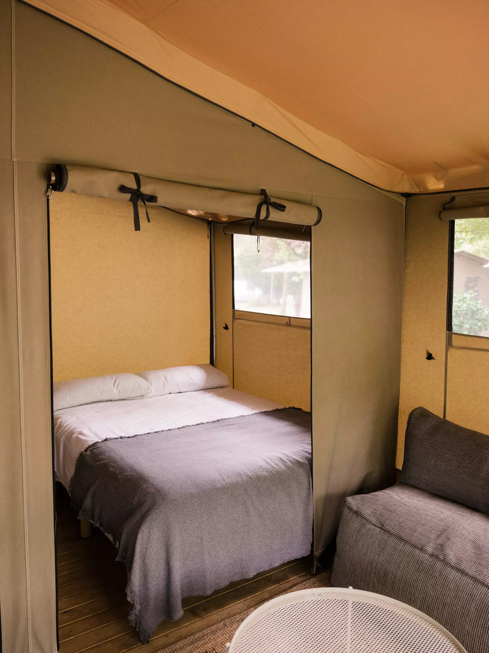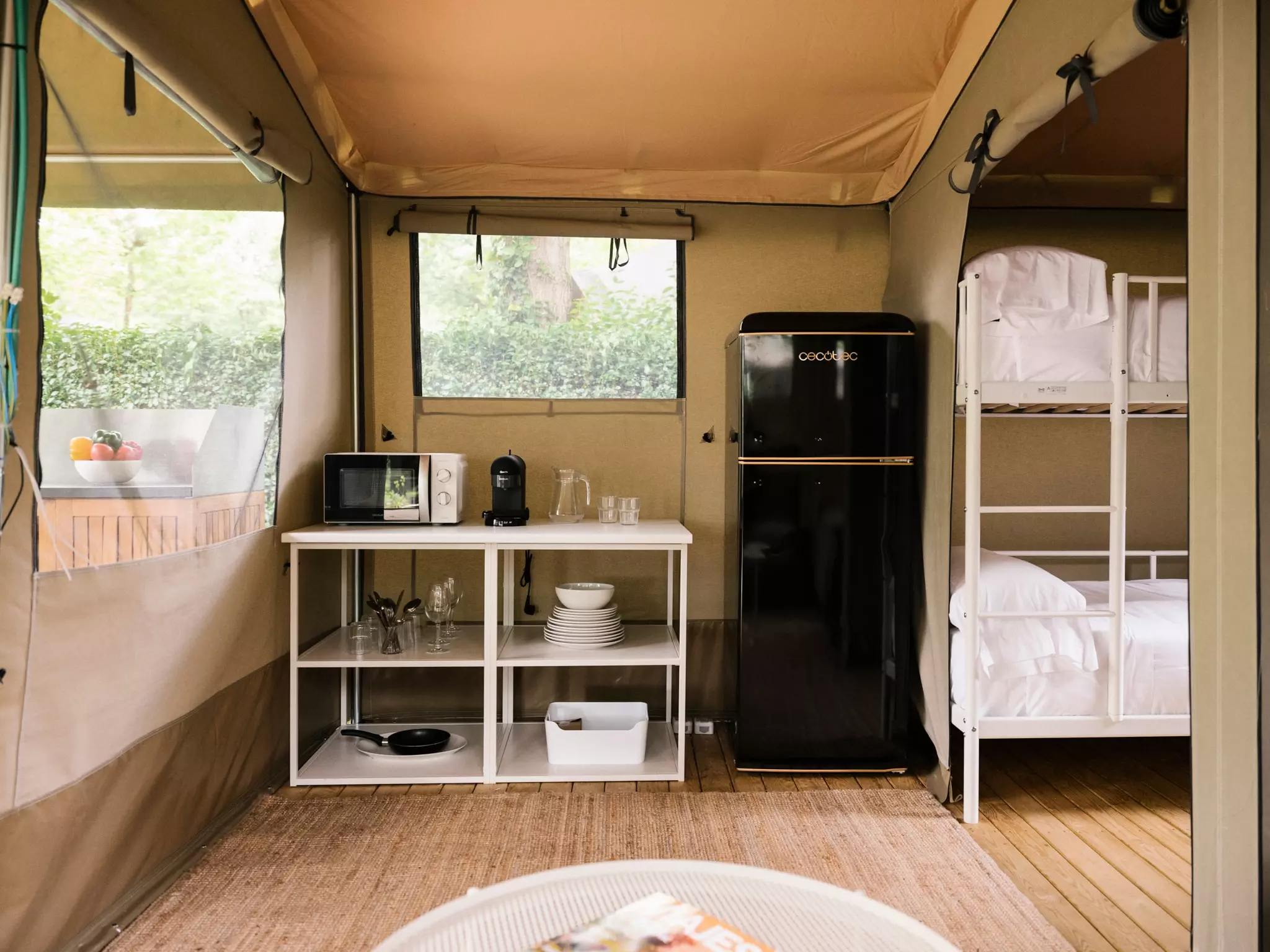 Notre tente Bell est idéale pour les couples qui recherchent quelque chose de différent en pleine nature au camping, avec une touche de luxe. Elle n'a pas de cuisine ni de salle de bain privée, mais les toilettes publiques se trouvent à quelques mètres de la tente. Le plus intéressant ? Elle dispose d'un lit double confortable, d'un mini-réfrigérateur, d'ustensiles de cuisine et d'un micro-ondes.
