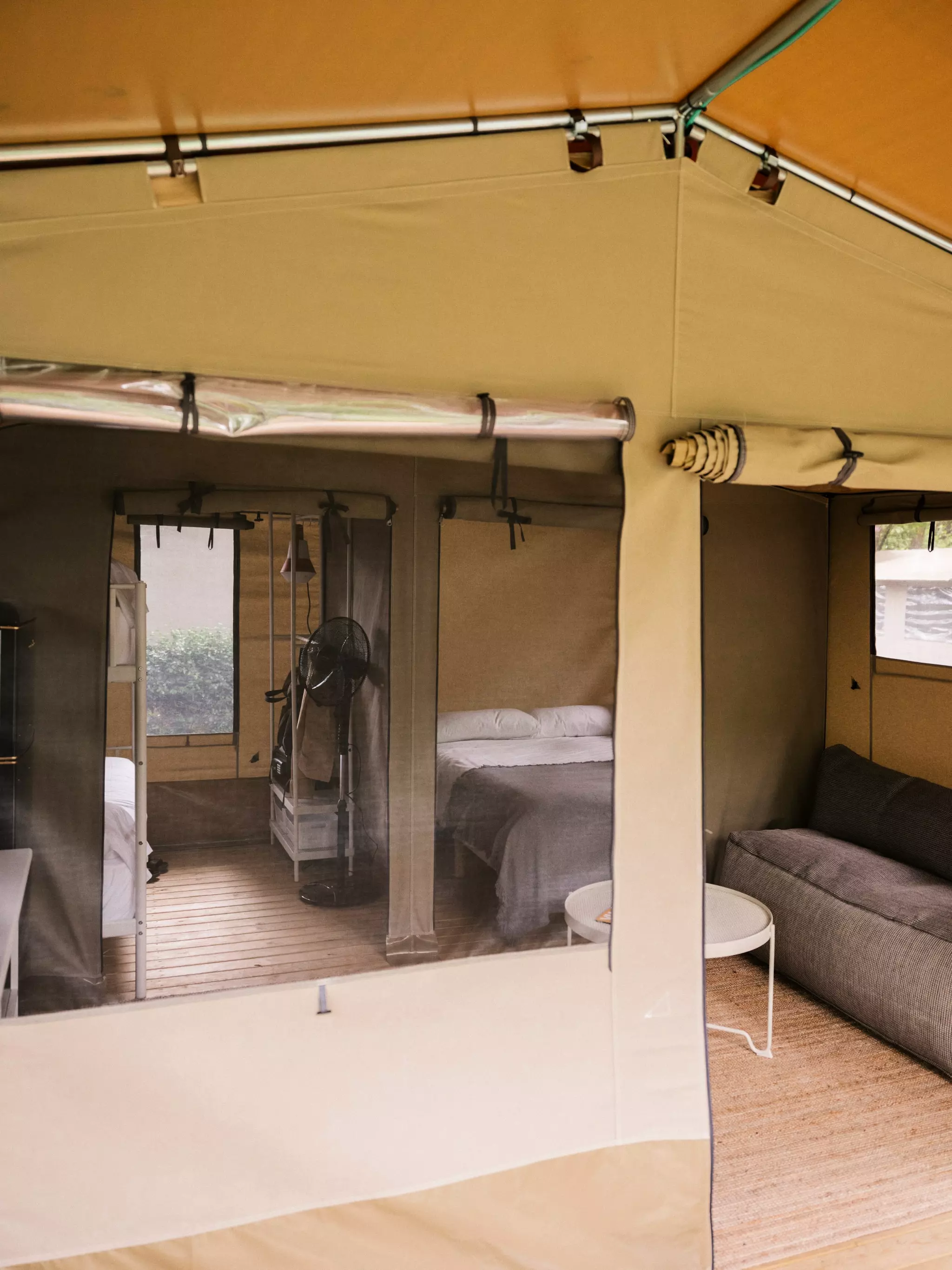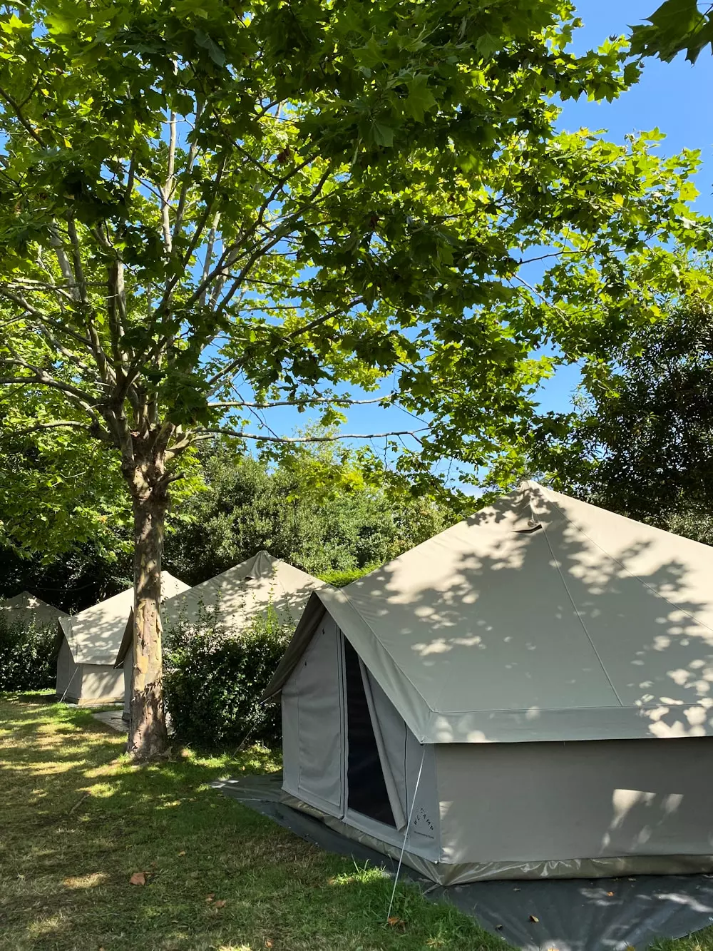 Notre tente Bell est idéale pour les couples ou les groupes de trois personnes qui recherchent quelque chose de différent en pleine nature au camping, avec une touche de luxe. Elle n'a pas de cuisine ni de salle de bain privée, mais les toilettes publiques se trouvent à quelques mètres de la tente. Le plus beau ? Elle dispose d'un lit double et d'un lit simple confortables, de tout le nécessaire (serviettes et draps), d'un mini-réfrigérateur, d'ustensiles de cuisine et d'un four à micro-ondes.