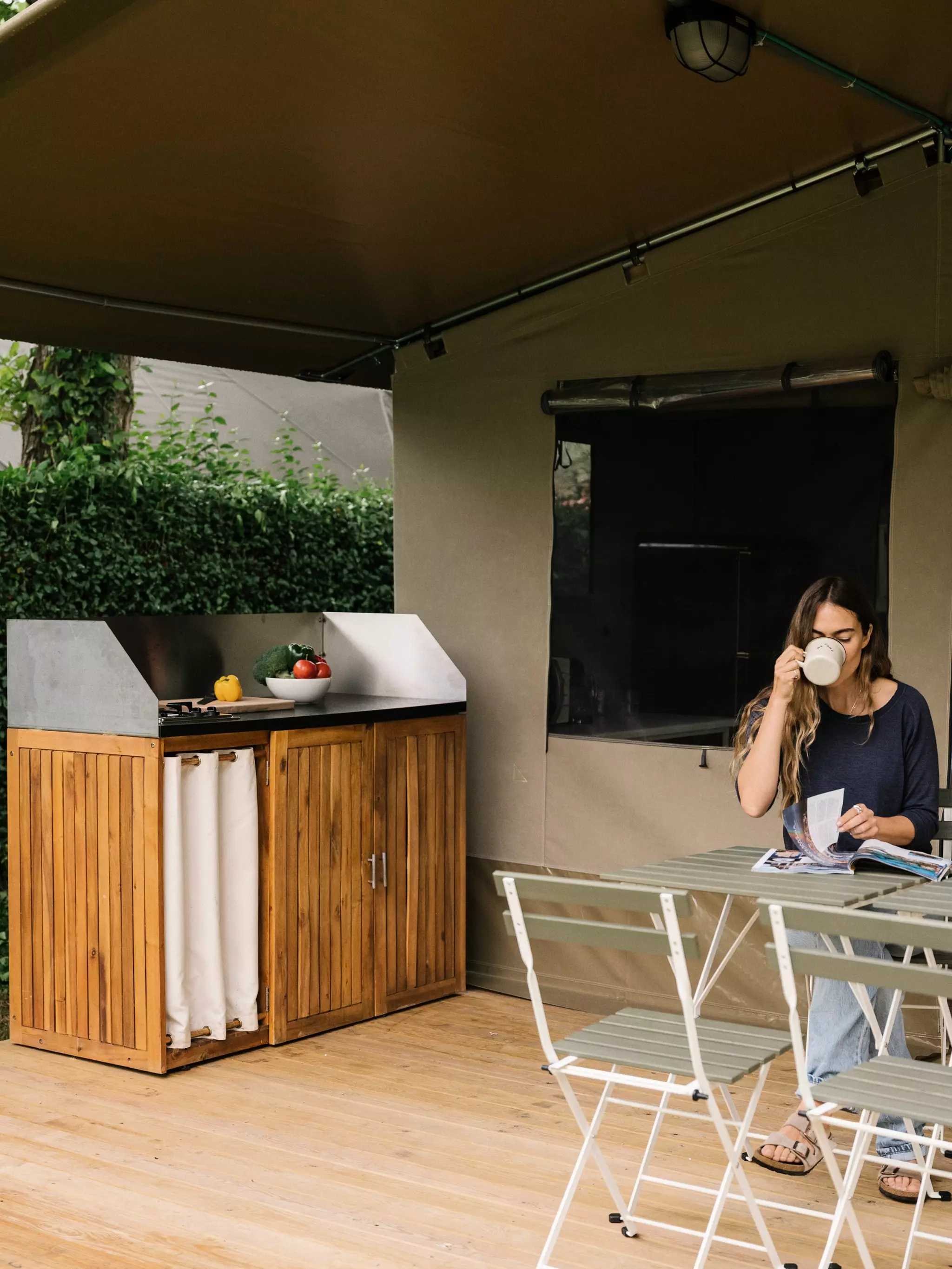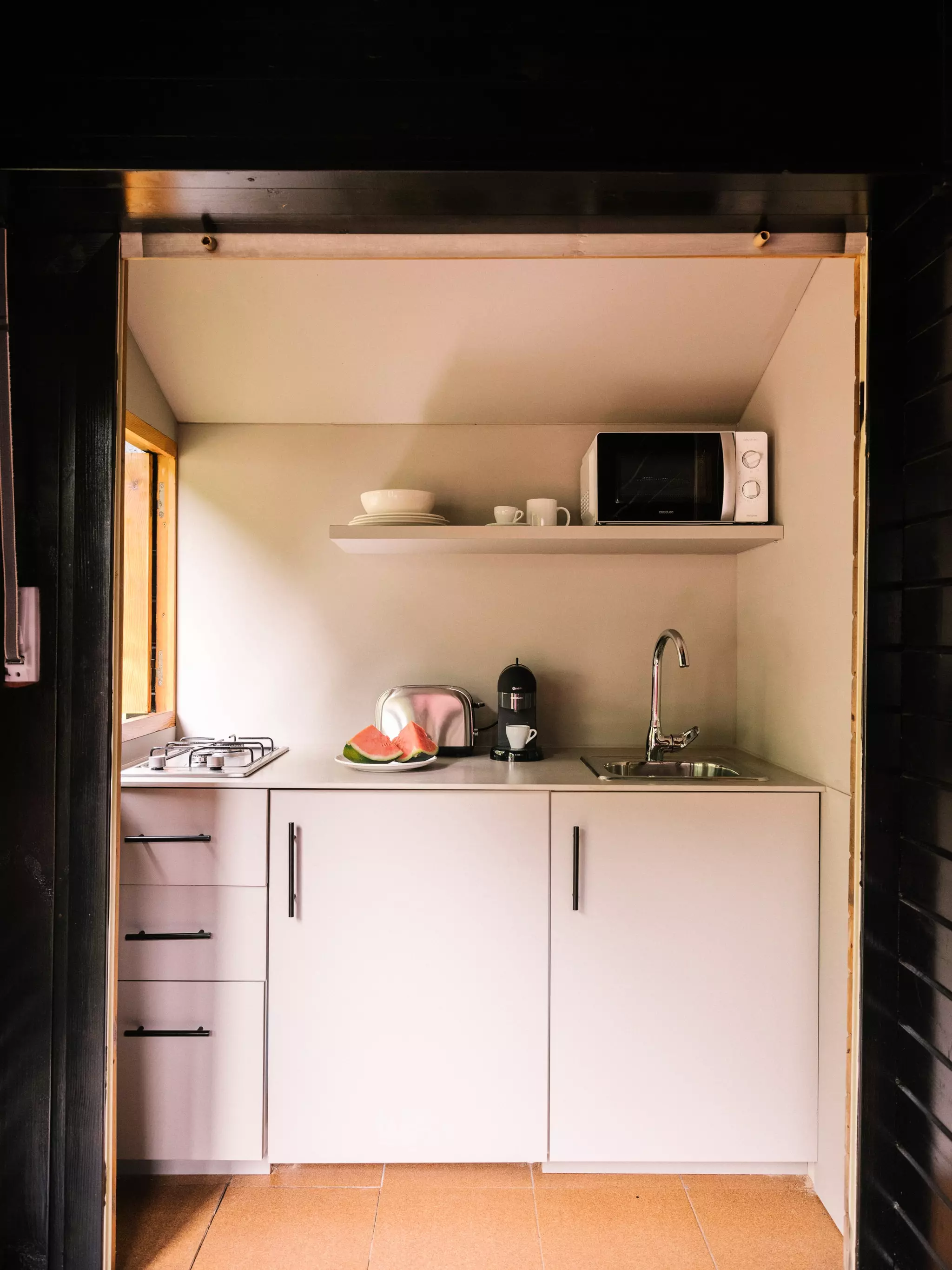 Pour ceux qui ne veulent pas apporter leur propre tente, nous proposons cet hébergement qui vous permet de profiter de l'expérience de camping la plus authentique avec une cuisine. Il peut accueillir jusqu'à 4 personnes et dispose d'un lit double et de 2 lits simples superposés. Il dispose d'une cuisine avec tous les ustensiles nécessaires pour votre séjour.